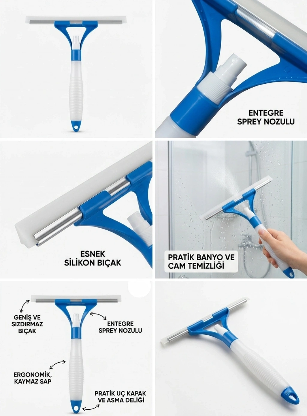 - Esnek Silikon Bıçak: Cam, ayna ve fayans gibi yüzeylerde iz veya tüy bırakmaz; yüzeye tam uyum sağlayarak suyu saniyeler içinde tahliye eder.