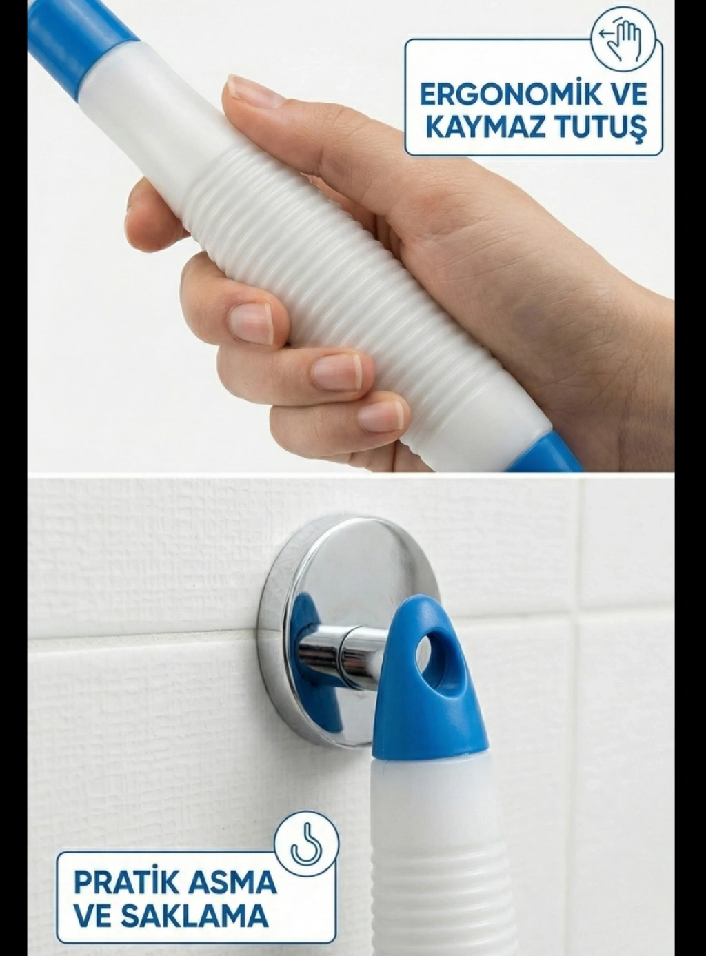 - Pratik Saklama Çözümü: Sap kısmındaki asma deliği sayesinde banyonuzda veya temizlik dolabınızda yer kaplamadan muhafaza edilebilir.