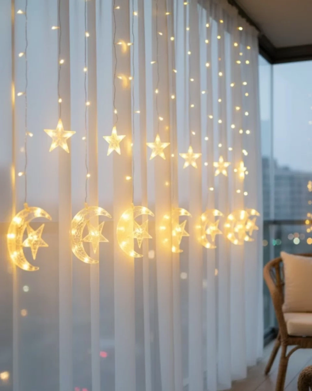 Bu hilal ve yıldız tasarımlı perde ışık, hem modern hem de geleneksel dekorasyon tarzlarına uyum sağlayacak şekilde tasarlanmıştır. Minimal iç mekânlarda zarif bir detay olarak öne çıkarken, klasik dekorlarda tamamlayıcı bir unsur olur.Sıcak beyaz ışık tonu göz yormaz ve ortamda yumuşak bir aydınlatma etkisi oluşturur. İki modlu kullanım özelliği sayesinde hem sade hem hareketli dekorasyon seçenekleri sunar.Dayanıklı malzeme yapısı sayesinde uzun süreli kullanım için uygundur. PVC kablo kaplaması sayesinde güvenlik ön planda tutulmuştur.Özellikle pencere önü, perde arkası, duvar dekoru ve organizasyon arka plan süslemelerinde tercih edilir. Işık açıkken figürler belirgin şekilde parlayarak dekoratif görünümü artırır.