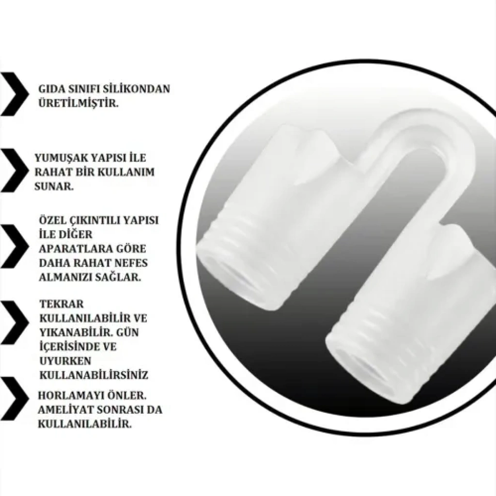 Amaç: Burun deliklerini genişleterek hava akışını ve oksijen alımını artırmak, horlamayı azaltmak.Malzeme: Yumuşak silikon yapısı sayesinde burun deliklerini tahriş etmez ve acıtmaz.Etki: Kullanıldığı ilk andan itibaren daha fazla oksijen alındığını hissettirir.Kullanım: Kolay kullanımı sayesinde her zaman yanınızda bulundurulabilir.Fonksiyon: Geceleri uyurken daha sağlıklı nefes almanıza yardımcı olur.Kullanım AlanlarıHorlama Sorunu: Uyku sırasında horlamayı azaltmak ve hava yolu tıkanıklığını hafifletmek için.Uyku Kalitesi: Kendinizin ve eşinizin uyku kalitesini artırmak için.Nefes Alma Kolaylığı: Egzersiz sırasında veya alerji gibi durumlarda burun yoluyla nefes almayı kolaylaştırmak için.Seyahat: Otel veya seyahatlerde sessiz ve rahat bir uyku için pratik çözüm.Paket İçeriği1 Adet Horlama Önlemeye Yardımcı Burun Aparatı Seti.