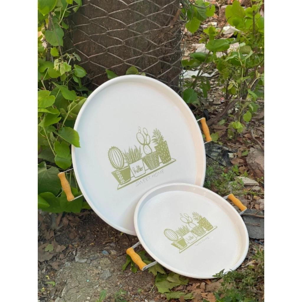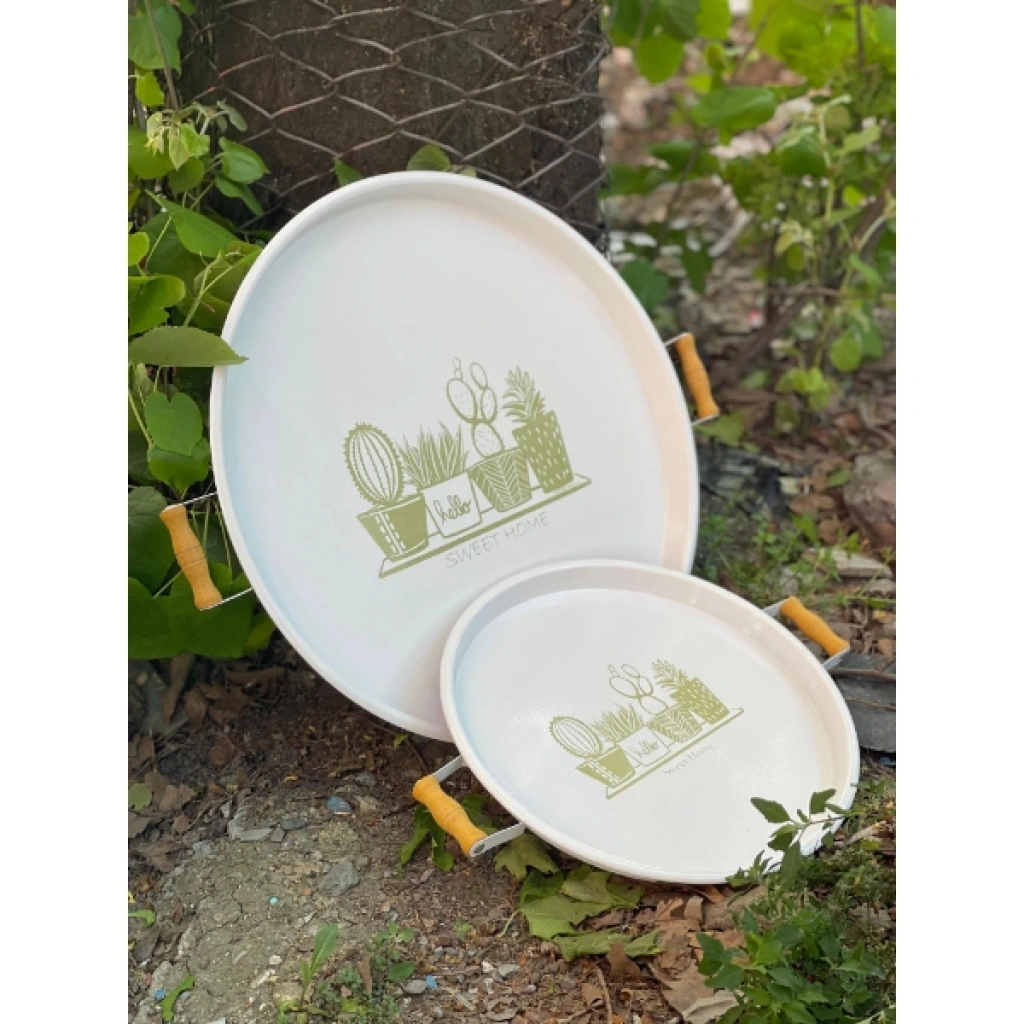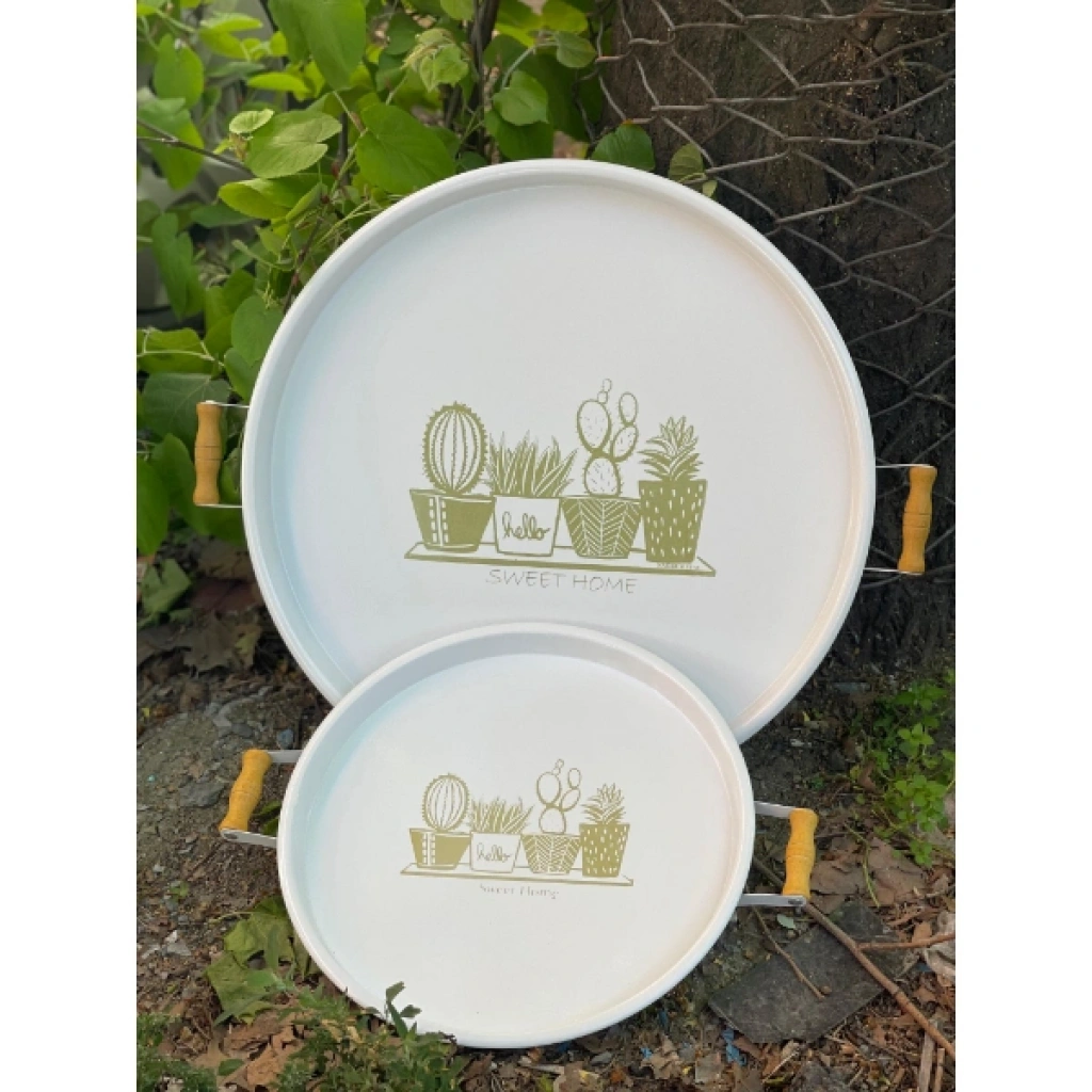 Büyük boy tepsinin çapı 51 cm, küçük boy tepsinin çapı ise 37 cm'dir. Bu şık ikili tepsi seti, yuvarlak formu ve estetik tasarımıyla mükemmel bir sunum aracıdır. Ahşap tutma kulpları sayesinde rahatlıkla taşınabilir. Hem işlevsel hem de dekoratif olarak kullanılabilir. Evde misafir ağırlarken, kahve saati sunumları veya yemek servisleri için ideal bir seçenektir. Modern tarzı ve pratikliğiyle her evde yerini alacak.Paket İçeriği1 Adet İkili Yuvarlak Sunum Tepsisi Seti