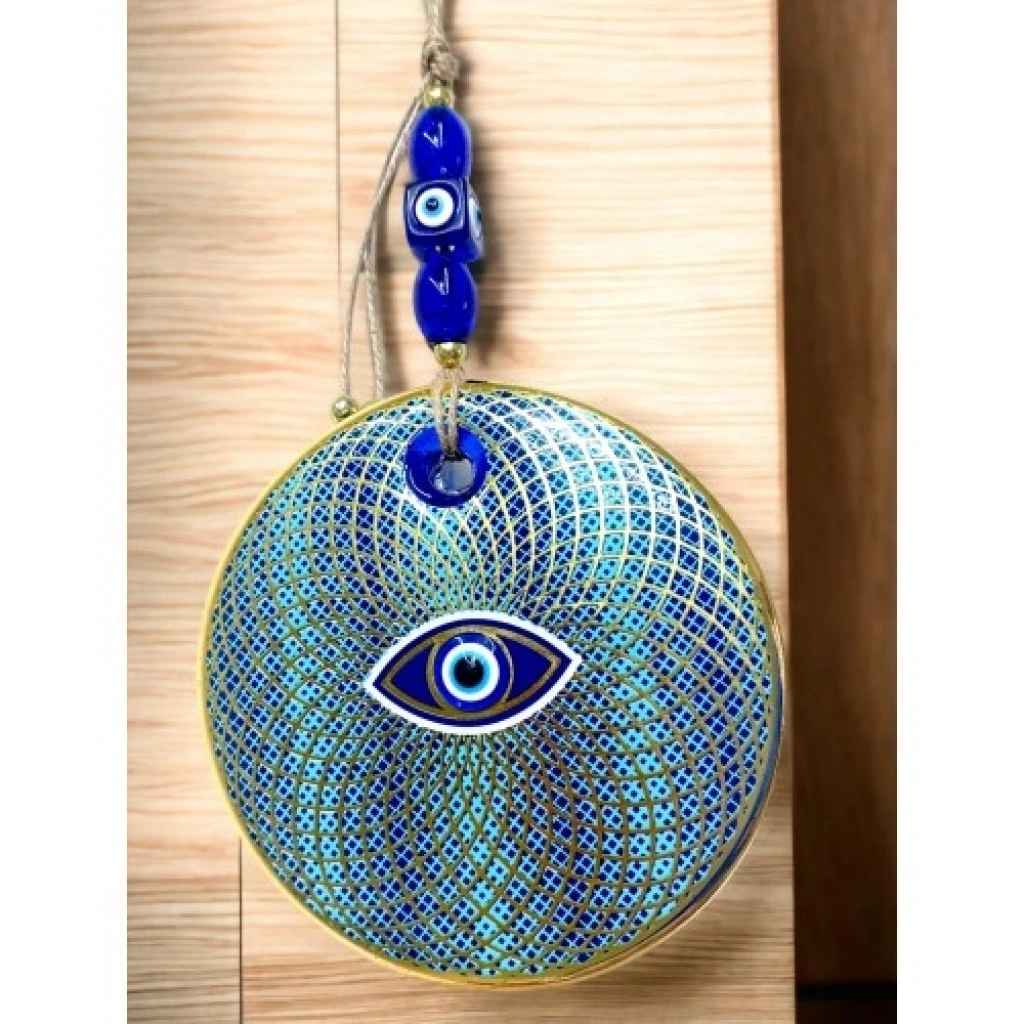 İşlemeli Geometrik Nazar Boncuklu Cam Duvar Süsüİşlemeli, geometrik desenlerin modern estetiğiyle tasarlanan bu nazar boncuklu cam duvar süsü, dekoratif şıklığı ve manevi anlamı bir arada sunan özel bir üründür. Nazar boncuğu figürü, kötü enerjilere karşı koruyucu bir sembol olarak bilinirken geometrik motifler tasarıma çağdaş ve dengeli bir görünüm kazandırır.Ürünümüz mavi cam nazar boncuğundan tamamen el işçiliğiyle üretilmiştir. Camın parlak yüzeyi ve özenle işlenmiş geometrik desenler, ışığı estetik bir şekilde yansıtarak bulunduğu ortama ferah ve dikkat çekici bir atmosfer kazandırır. El yapımı olması sayesinde her ürün kendine özgü ve benzersizdir.İşlemeli geometrik nazar boncuklu cam duvar süsümüzün yuvarlak ana gövdesi 13 santimetre çapındadır. İp dahil yaklaşık 30 santimetre toplam uzunluğa sahiptir. Hafif yapısı sayesinde duvara, kapıya veya pencere önüne kolaylıkla asılabilir.Salon, antre, ofis ve iş yeri dekorasyonları için ideal olan bu cam duvar dekoru; yeni ev hediyesi, iş yeri açılışı ve özel günler için modern, estetik ve anlamlı bir hediyelik alternatifi sunar.