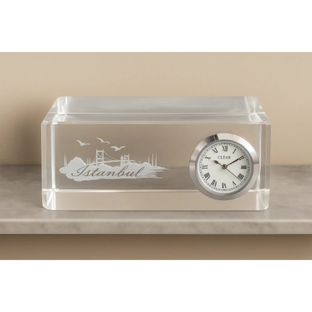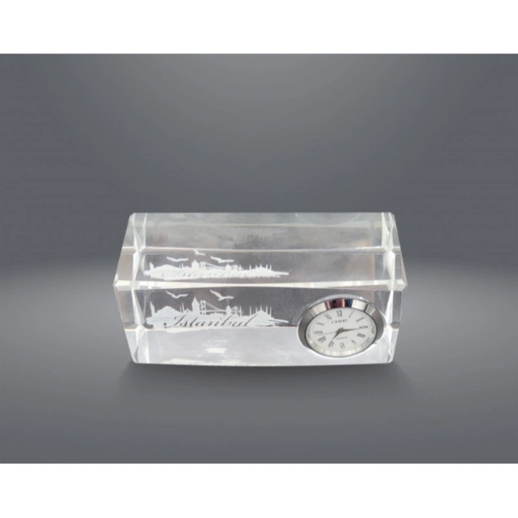 İstanbul tasarımlı kristal saatli biblo, şık tasarımı ve zarif işçiliği ile dikkat çeker. 5x12 cm boyutundaki ölçüleri sayesinde masaüstü, vitrin ve ofis dekorasyonları için ideal bir aksesuardır. Üzerindeki İstanbul silueti detayı ürüne özgün bir karakter kazandırırken, entegre saat işlevsellik sunar. Kristal malzeme, ışığı yansıtarak bulunduğu ortama sofistike bir hava katar. Hem dekoratif amaçla hem de fonksiyonel bir masaüstü aksesuar olarak kullanılabilir. Paket İçeriği1 adet İstanbul Tasarımlı Kristal Saatli Biblo