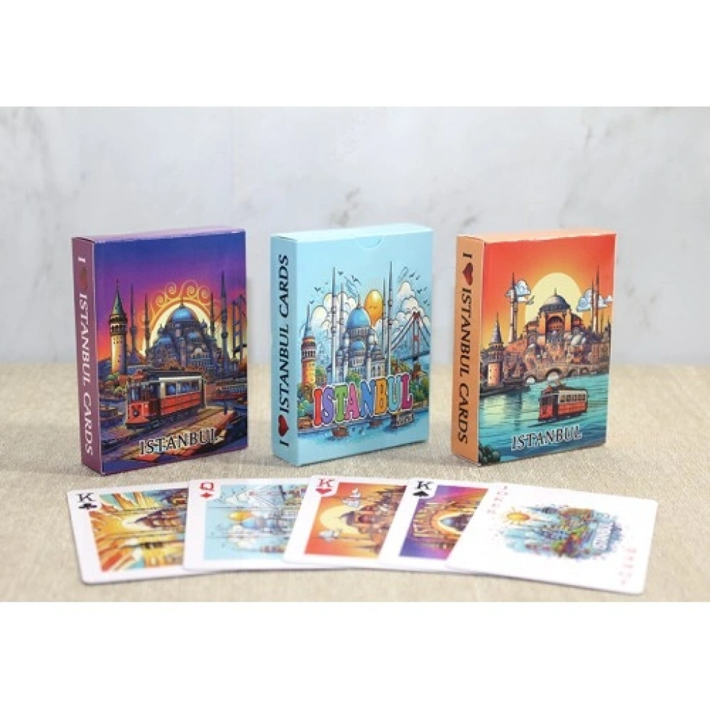 İSTANBUL TEMALI ÖZEL TASARIM OYUN KARTIKıtaları birleştiren şehrin büyüleyici atmosferini oyun masalarınıza taşıyın! İstanbul Temalı Oyun Kartı Desteği, Galata Kulesi'nden Ayasofya'ya, Boğaz'ın eşsiz manzarasından tarihi yarımadanın gizemine kadar İstanbul’un ikonik sembollerini her bir kartta yaşatıyor. Şık tasarımı ve kaliteli baskısıyla sadece bir oyun aracı değil, aynı zamanda şehrin ruhunu yansıtan bir sanat eseri.Öne Çıkan ÖzelliklerEşsiz Tasarım: Her bir kart, İstanbul'un en özel mekanları ve kültürel dokusuyla detaylandırılmıştır. Oynarken şehrin sokaklarında bir tura çıkmış gibi hissedeceksiniz.Koleksiyonluk Parça: İstanbul tutkunları ve seyahatseverler için mükemmel bir hediye seçeneği olan bu deste, koleksiyonunuzun en değerli parçalarından biri olacak.İdeal Boyut: 9 cm ölçüleri ile ele tam oturur, kart oyunlarınızda konforlu ve akıcı bir kullanım sağlar.Şık ve Renkli: Canlı renk paleti ve yüksek baskı kalitesi, kartlara modern ve estetik bir hava katar.Çok Yönlü Kullanım: İster arkadaşlarınızla keyifli bir oyun saati geçirin, ister vitrininizde dekoratif bir İstanbul anısı olarak sergileyin.Neden Tercih Etmelisiniz?İstanbul Hatırası: Şehri ziyaret edenler veya İstanbullu olup bu şehre gönül verenler için harika bir anı.Farklı Bir Deneyim: Klasik oyun kartlarından sıkılanlar için görselliğiyle fark yaratan, sohbet başlatıcı bir aksesuardır.Estetik Hediye: Şık ambalajı ile sevdiklerinizi mutlu edebileceğiniz, incelikle düşünülmüş özel bir hediye alternatifidir.Teknik Özellikler TablosuÖzellikDetayÜrün TipiTematik Oyun Kartı DesteğiTemaİstanbul (İkonik Yapılar)Boyut9 cmKullanımOyun, koleksiyon, dekorasyonPaket İçeriği1 Adet İstanbul Temalı Kart Desteği
