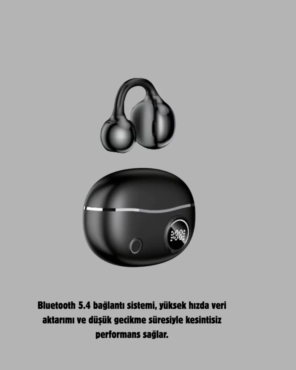 Açık kulak tasarımına sahip bu kablosuz Bluetooth kulaklık, dış sesleri tamamen kapatmadan müzik dinlemek isteyen kullanıcılar için geliştirilmiş modern ve ergonomik bir modeldir. Kulağın içine girmeyen yapısı sayesinde uzun süreli kullanımda hiçbir baskı oluşturmaz ve kulakta ağırlık hissi yaratmaz. Özellikle yürüyüş, koşu, bisiklet kullanımı gibi açık hava aktivitelerinde çevreyi duyabilmek güvenliği artırdığı için oldukça önemlidir. Bu kulaklık tam da bu ihtiyaca yönelik tasarlanmıştır.Nefes alabilen silikon kaplaması sayesinde kulakla temas eden yüzey yumuşak, esnek ve terlemeye dayanıklıdır. Hafif gövdesi kulakta yokmuş hissi verir ve yoğun aktivitelerde dahi rahatsızlık oluşturmaz. Açık kulak yapısı sayesinde kulağın doğal formunu korur ve uzun süre müzik dinleyen kullanıcılar için önemli bir konfor sağlar.Bluetooth 5.4 teknolojisi, daha kararlı ve hızlı bağlantı sunar. Video izlerken ya da oyun oynarken düşük gecikme sağlayan yapısı, senkron ses deneyimi sunar. APTX ses teknolojisi ise dinamik bas ve net tiz dengesini sağlar. Sesin doğal, güçlü ve dengeli bir şekilde kulağa ulaşmasını mümkün kılar.Type-C hızlı şarj desteği, kulaklığı kısa sürede yeniden kullanıma hazır hale getirir. Tek kulaklık 6 saat boyunca kesintisiz kullanım sağlarken, şarj kutusu bu süreyi 30 saate kadar uzatır. Bu uzun kullanım süresi, gün boyu müzik keyfi yaşamak isteyen kullanıcılar için büyük bir avantajdır.Dokunmatik sensörleri sayesinde cihaz üzerindeki işlemleri hızlıca yönetebilirsiniz. Müzik geçişleri, çağrı yanıtlama veya duraklatma gibi kontroller pratik bir şekilde yapılabilir. Tasarım olarak hem spor hem günlük stil ile uyum sağlayan sade ve modern bir görünüm sunar.Aktif yaşam tarzına sahip kullanıcılar, dış mekân sporlarıyla ilgilenenler veya kulak içi tasarımlardan rahatsız olanlar için mükemmel bir seçenektir. Konforu, ses kalitesi ve teknolojik özellikleriyle üstün bir kullanım deneyimi sunar.
