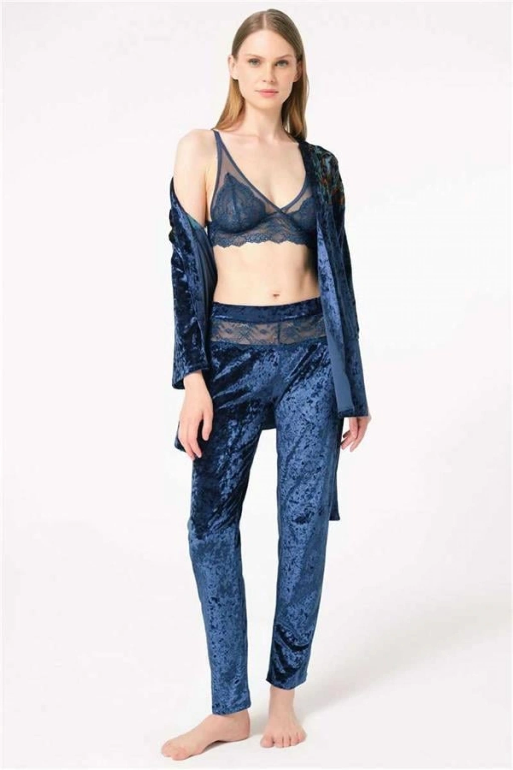 VipMarketim Kadın Kadife Çiçek Baskılı Sabahlık Balensiz Desteksiz Dolgusuz Dantelli Bralet Sütyen Ve Pantolon Pijama 3'Lü Takım ( ) (Kod:5699)