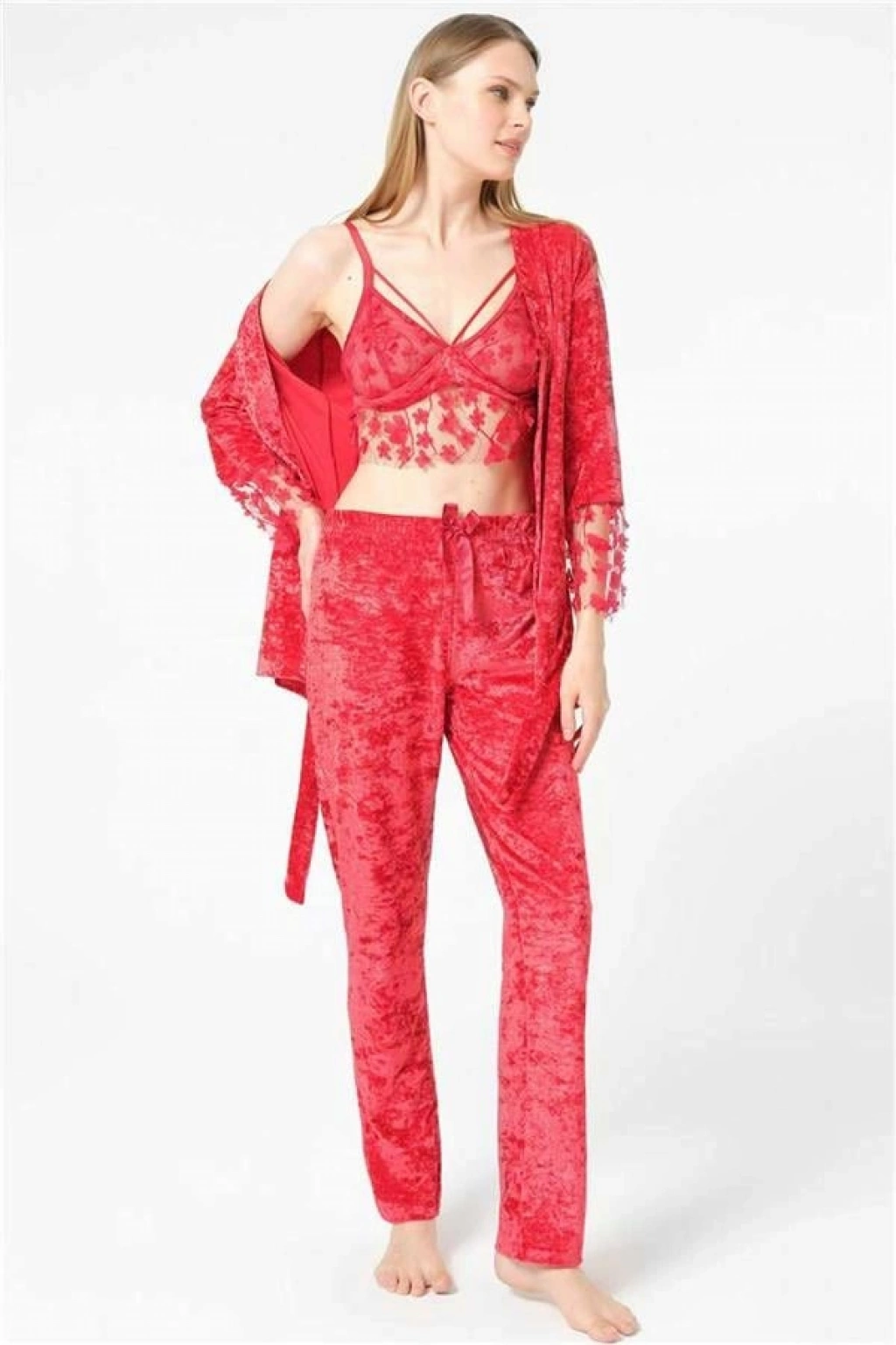 VipMarketim Kadın Kadife Dantelli Sabahlık Balensiz Desteksiz Dolgusuz Yaka Detaylı Bralet Sütyen Ve Pantolon Pijama 3'Lü Takım ( ) (Kod:5634)