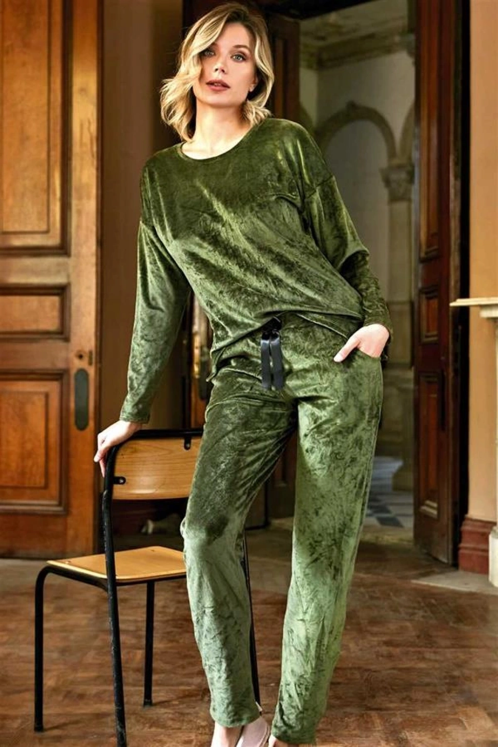 VipMarketim Kadın Kadife Sırt İşlemeli Uzun Kollu Sweatshirt Ve Yandan Cepli Pantolon Pijama Takım ( ) (Kod:9799)