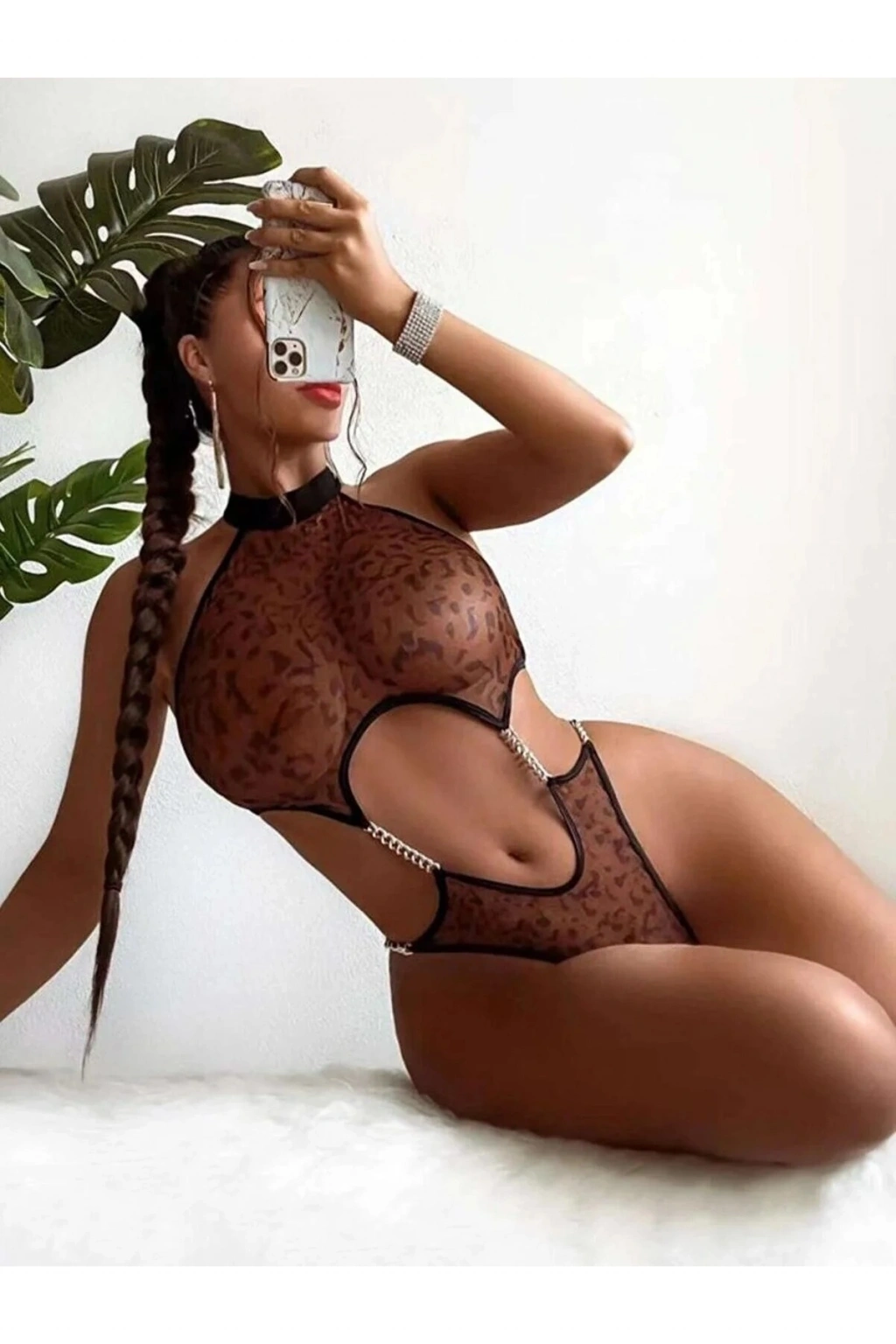 Kadın Leopar Desen Zincirli Kahverengi Seksi Babydoll Fantezi Kostüm