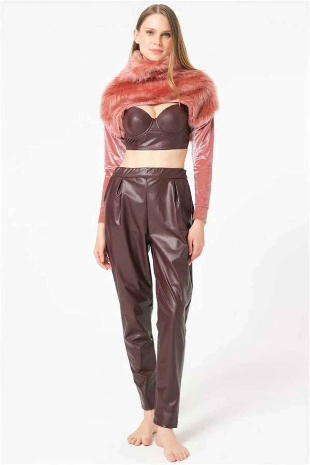VipMarketim Kadın Polar Kumaş Bolero Deri Görünümlü Balenli Destekli Dolgulu Askıları Çıkabilen Büstiyer Sütyen Ve Yandan Cepli Pantolon Pijama 3'Lü Takım ( ) (Kod:9761)