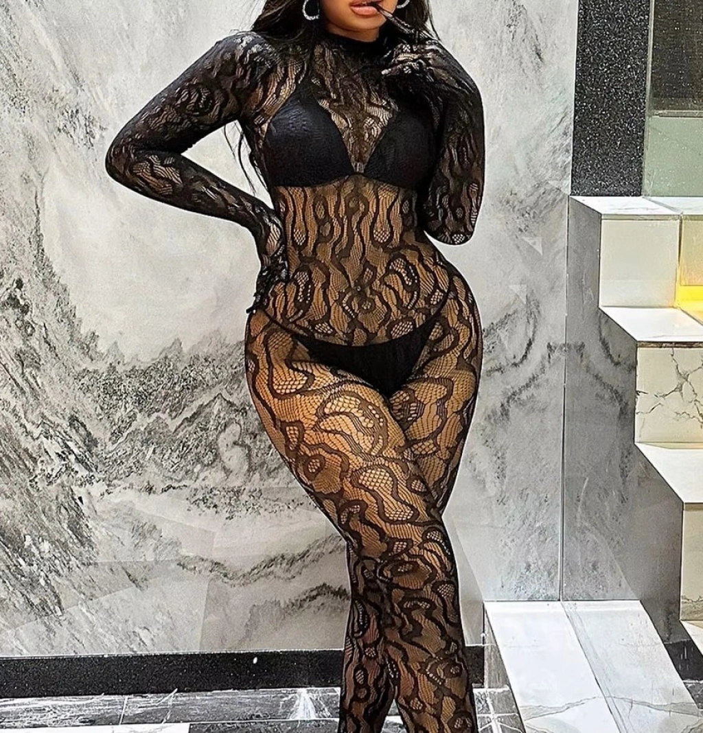 VipMarketim Kadın Seksi Leopar Desenli Transparan File Tulum Uzun Kollu Eldivenli Büyük Beden Vücut Çorabı