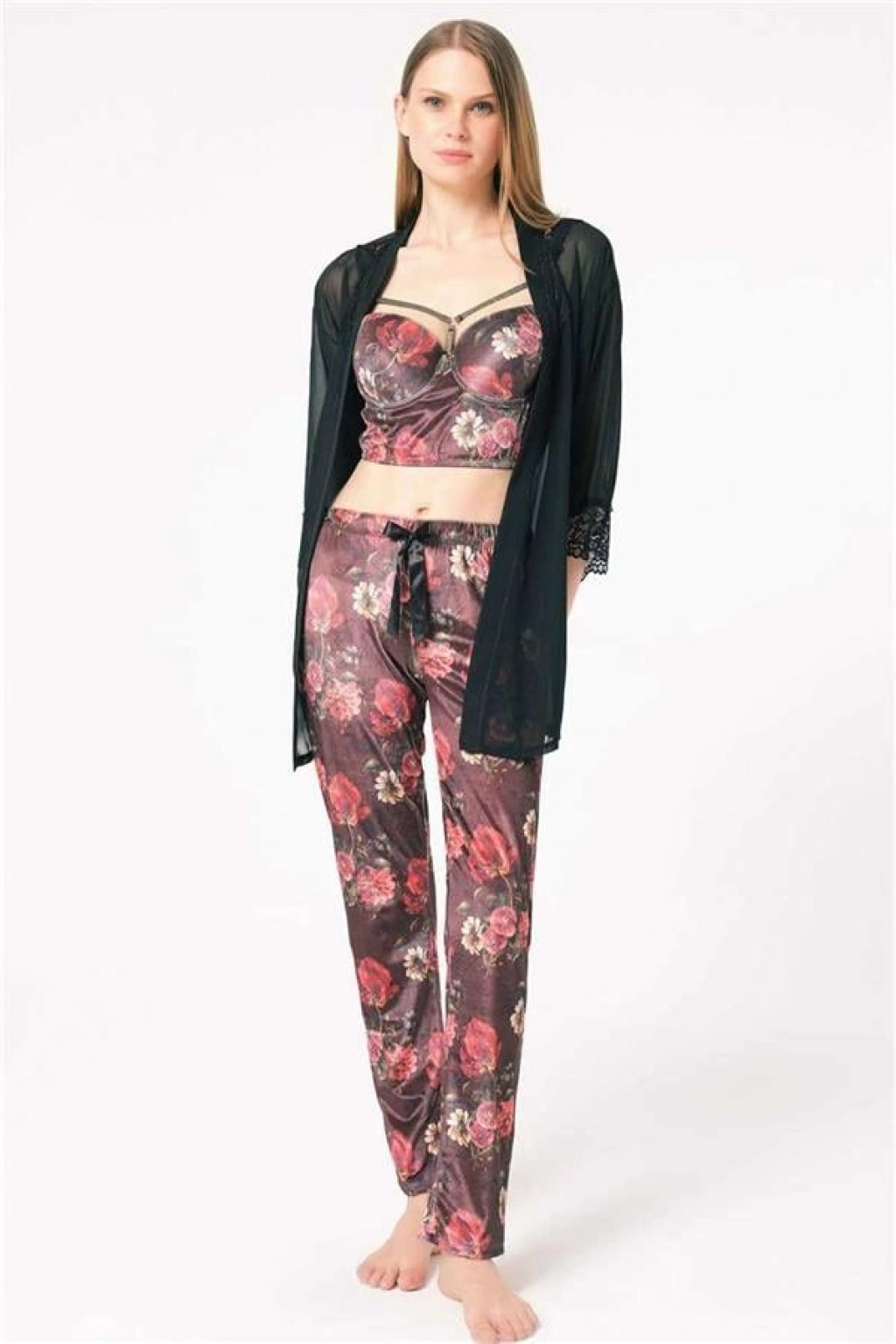 VipMarketim Kadın Tül Dantelli Sabahlık Balenli Destekli Dolgulu Yaka Detaylı Çiçek Baskılı Kadife Büstiyer Sütyen Ve Pantolon Pijama 3'Lü Takım ( ) (Kod:5683)