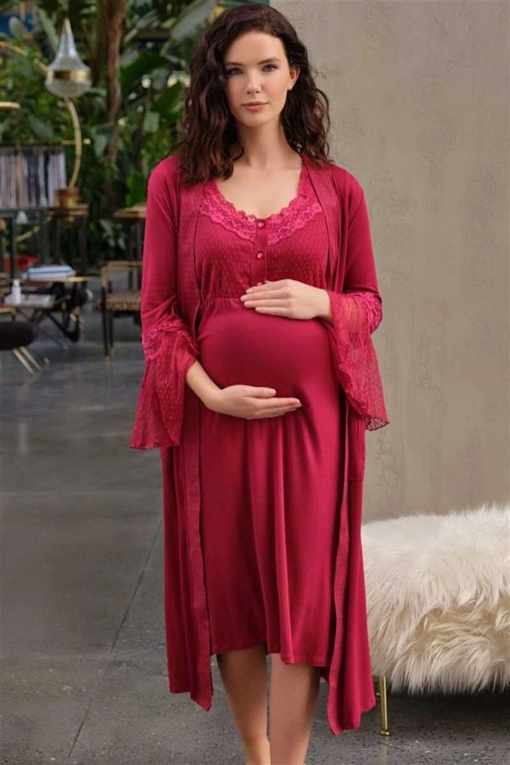 VipMarketim Kadın Viskon Hamile Lohusa Dantelli Sabahlık Ve Baskılı Önden Açılan Emzirme Uzun Gecelik Elbise Takım ( ) (Kod:5649)