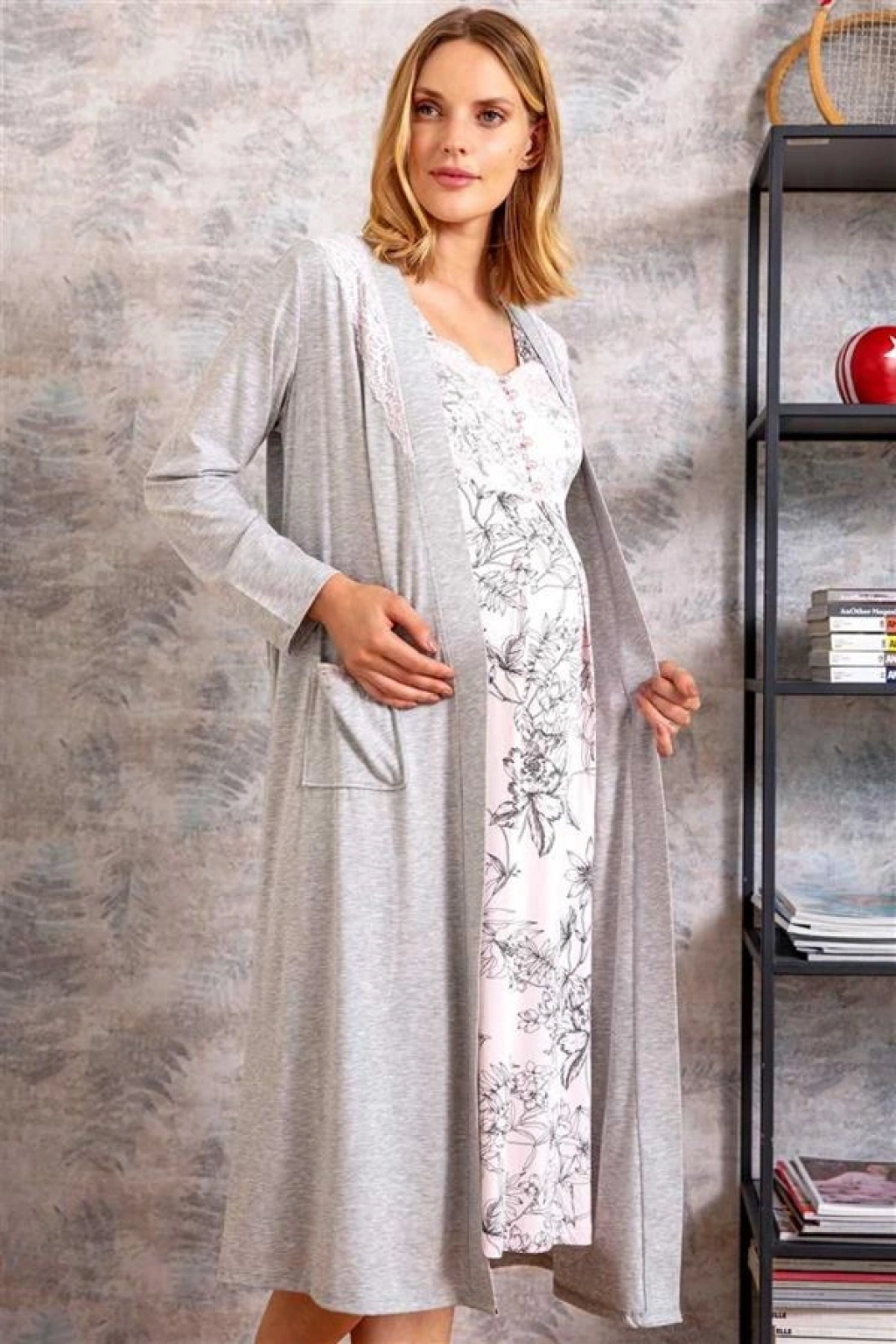 VipMarketim Kadın Viskon Hamile Lohusa Dantelli Sabahlık Ve Çiçek Baskılı Önden Açılan Emzirme Uzun Gecelik Elbise Takım ( ) (Kod:5544)