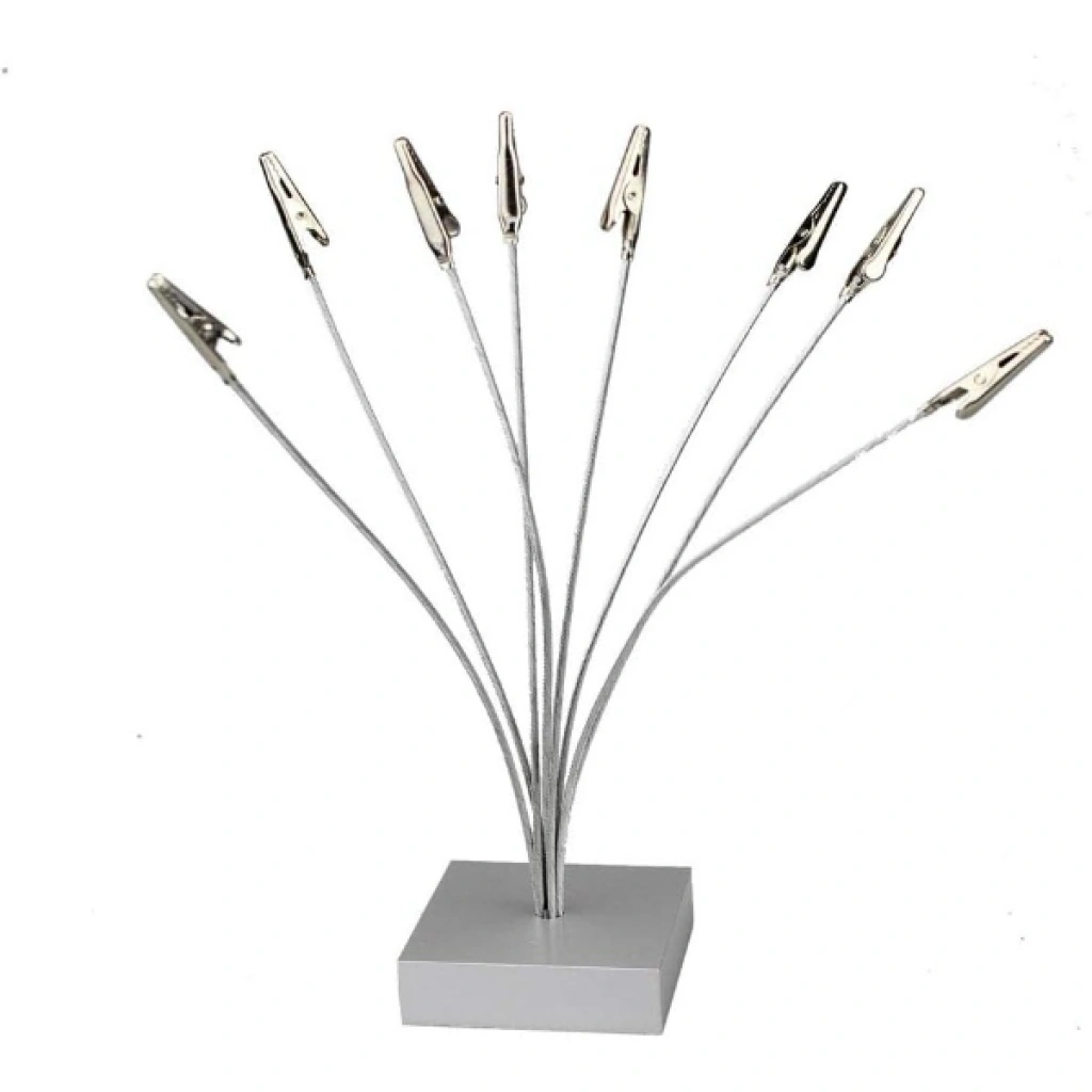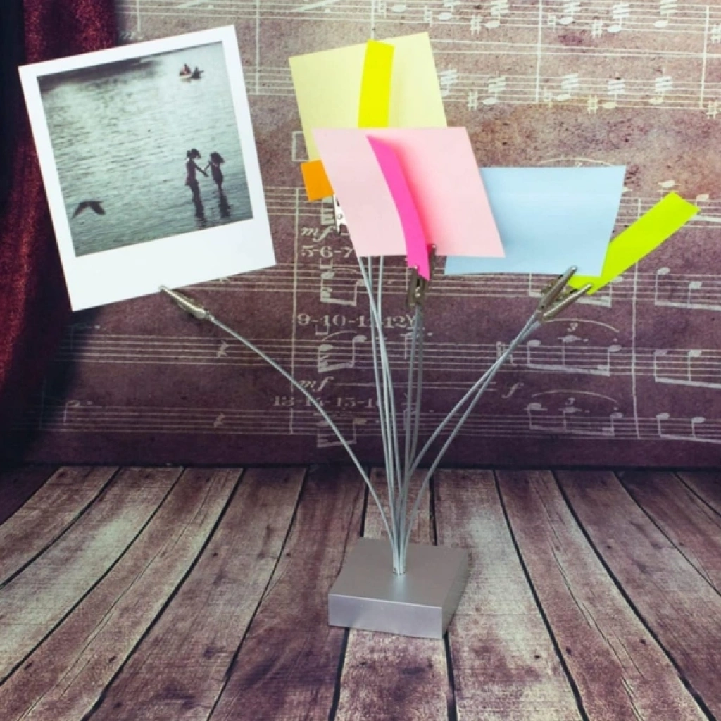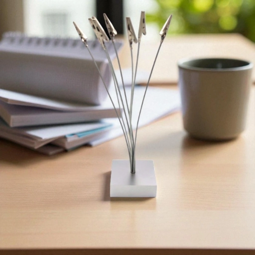 Masa düzeninizi korumanın en şık yollarından biri olan Kıskaçlı Kağıt Tutacağı, ofis, çalışma alanı veya resepsiyon masalarında pratik kullanım sağlar. 24x7 cm boyutlarındaki bu ürün, çoklu metal kıskaç sistemiyle notlarınızı, kartvizitlerinizi, fotoğraflarınızı veya önemli belgelerinizi düzenli şekilde sergilemenize imkân tanır.Esnek metal telleri sayesinde farklı yükseklik ve açıları kolayca ayarlayabilir, belgeleri estetik bir biçimde konumlandırabilirsiniz. Sağlam tabanı devrilmeyi önlerken, paslanmaz çelikten üretilmiş kıskaçları uzun ömürlü kullanım sunar. Minimalist ve modern tasarımıyla masa üstü dekorasyonuna da zarif bir dokunuş katar. Paket İçeriği1 adet Kıskaçlı Kağıt Tutacağı