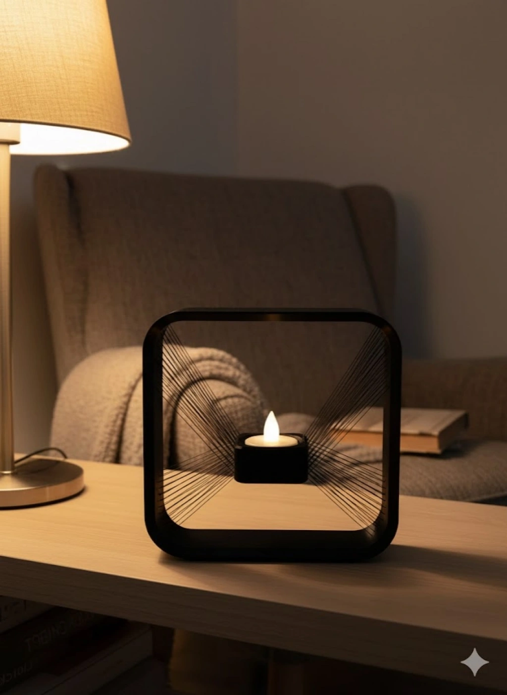 Kare formda tasarlanan askılı mumluk, duvar dekorasyonuna farklı bir boyut kazandırır. Salon, oturma odası, antre veya yatak odası gibi alanlarda rahatlıkla kullanılabilir. Mum ışığıyla birlikte ortamda yumuşak ve sıcak bir ambiyans oluşturur. Duvara asılı yapısı sayesinde tek başına güçlü bir dekor unsuru olarak öne çıkar. Modern, bohem veya sade dekorasyon stilleriyle uyum sağlar.