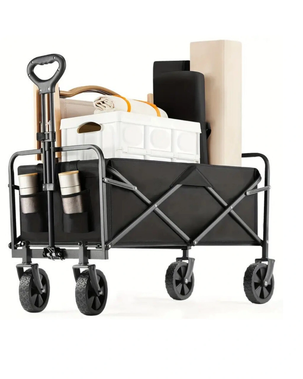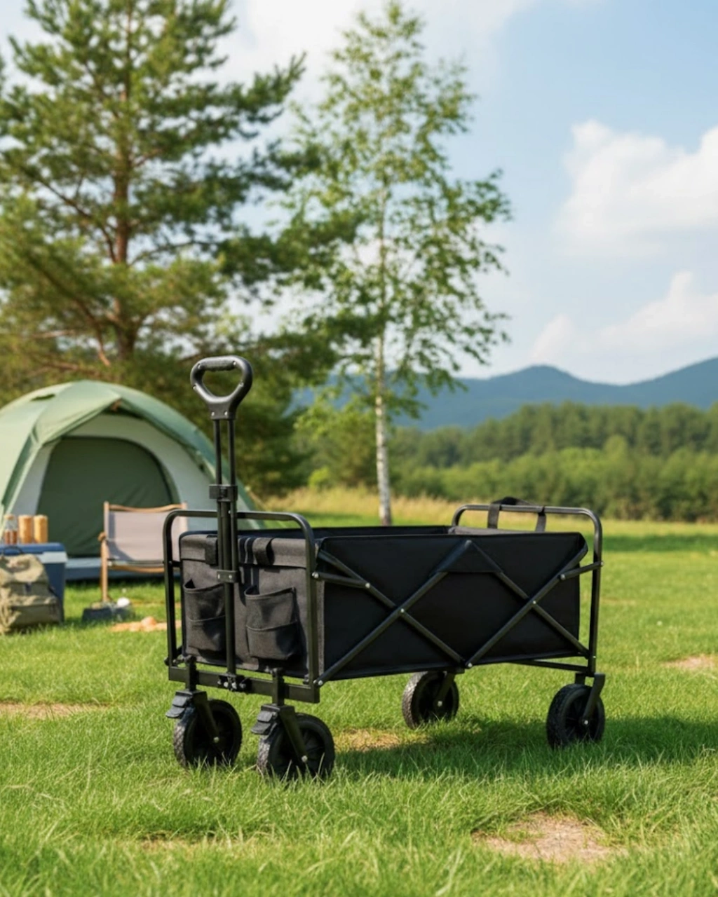 Katlanabilir Taşınabilir Kamp Arabası, açık hava aktivitelerinde, günlük taşıma ihtiyaçlarında ve ev kullanımında pratiklik sunmak üzere tasarlanmış çok yönlü bir taşıma vagonudur. Kamp, plaj, bahçe işleri, alışveriş ve piknik gibi farklı kullanım alanlarında eşyaların zahmetsiz şekilde taşınmasına yardımcı olur. Özellikle hareket halindeyken ağır ve hacimli eşyalarla uğraşmak istemeyen kullanıcılar için ideal bir çözümdür.Katlanabilir tasarımı sayesinde kullanım sonrasında saniyeler içinde katlanarak kompakt bir hale gelir. Bu özellik, ürünün bagajda, evde veya depolama alanlarında minimum yer kaplamasını sağlar. Montaj gerektirmeyen yapısı sayesinde kutudan çıkarıldığı anda kullanıma hazırdır. Katlamak için alt orta kemerin yukarı kaldırılması yeterlidir, böylece pratik ve hızlı bir kullanım sunar.Geniş iç hacmi ve maksimum 74,8 kg taşıma kapasitesi, büyük ve ağır eşyaların güvenle taşınmasına olanak tanır. Piknik malzemeleri, kamp ekipmanları, bahçe aletleri veya alışveriş torbaları rahatlıkla taşınabilir. Ayrıca küçük eşyalar için tasarlanmış 2 adet ekstra cep, düzenli kullanım avantajı sağlar.Ön tekerleklerin 360 derece dönebilme özelliği, arabaya yüksek manevra kabiliyeti kazandırır. Kum, çakıl, çimen ve toprak gibi farklı zeminlerde rahat bir sürüş sunar. Bu sayede plajda, kampta veya bahçede yön değiştirmek son derece kolaydır.Ayarlanabilir kulp sistemi, kullanıcı boyuna ve kullanım açısına göre esnek ayarlama imkânı tanır. Kilitlenebilir yapısı sayesinde kullanım sırasında sabit kalır ve güvenli bir sürüş sağlar. Çerçevesi toz boya kaplı çelikten üretilmiş olup deformasyona karşı dayanıklıdır. 600D Oxford kumaşı ise yırtılmaya karşı dirençlidir ve çıkarılarak kolayca temizlenebilir.Katlanabilir Kamp Arabası, dayanıklılığı, geniş kapasitesi ve kullanım kolaylığı ile açık hava ve günlük taşıma ihtiyaçlarında güvenilir bir yardımcıdır.