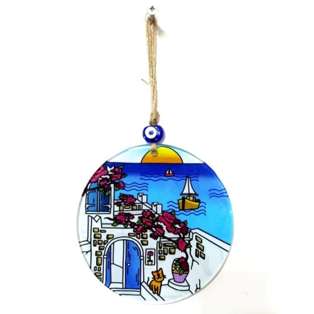 Kedili hayal evi duvar süsümüz; deniz ve sahil manzaralı bir evden güneşli bir günü izlemeyi simgelemektedir. Fuşya renk çiçeklerle süslenmiş eve sahip duvar süsümüz 15 santimetre çapındadır. Ürünümüz ip dahil 26 santimetre boyundadır. Ürünümüz füzyon cam malzeme kullanılarak üretilmektedir.