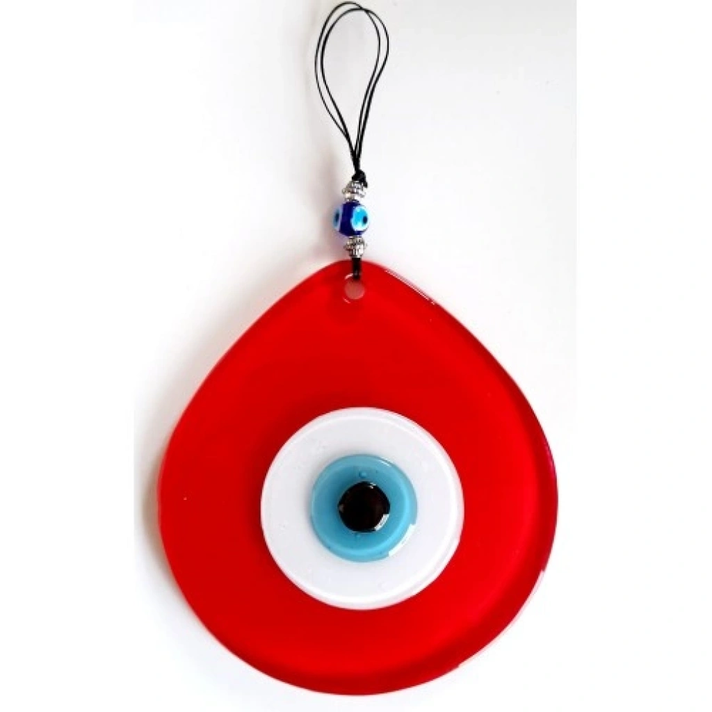 Kırmızı renk damla modeli nazar boncuklu duvar süsümüz tamamen el işçiliği ile üretilmiştir. Tasarım harikası el yapımı nazar boncuklu duvar süsümüz 13x12 santimetre ölçülerindedir. İp dahil toplam 21 santimetre boyundadır.