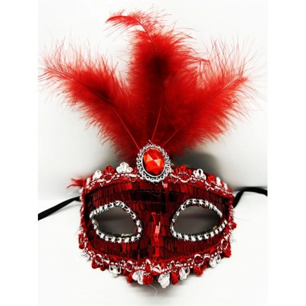 ve AvantajlarıGöz Alıcı Payet Dokusu: Maskenin tüm yüzeyi parlak kırmızı payet ve pullarla kaplanmıştır. Her hareketinizde parıldayarak odak noktası olmanızı sağlar.Zarif Tüy Detayı: Maskenin üst kısmında yer alan yumuşak tüyler, tasarıma derinlik ve yükseklik katarak daha görkemli bir duruş sergiler.İdeal Boyutlar: 17x20 cm (tüy dahil) ölçüleriyle yüz hatlarını estetik bir şekilde çerçeveler.Kaliteli ve Dayanıklı: Birinci sınıf plastik malzemeden üretilen gövdesi, hem sağlamdır hem de yüzünüzde ağırlık yapmayacak kadar hafiftir.Güvenli Bağlantı Aparatı: Arkasındaki ip aparatı sayesinde her kafa yapısına göre kolayca ayarlanabilir; dans ederken veya hareket halindeyken yüzden düşmez.Kullanım AlanlarıMasquerade (Maskeli Balo) ve Karnavallar: Geleneksel Venedik ruhunu kırmızı rengin enerjisiyle yansıtmak isteyenler için mükemmel seçim.Yılbaşı ve Kostüm Partileri: Kırmızı konseptli davetlerin, "Lady in Red" kostümlerinin ve özel kutlamaların en şık tamamlayıcısı.Sahne Performansları ve Dans: Tiyatro, kabare veya modern dans gösterilerinde karakterinize gizem katmak için idealdir.Fotoğraf Çekimleri: Sanatsal portre çekimlerinde veya özel gün albümlerinde çarpıcı ve estetik bir görsel sunar.