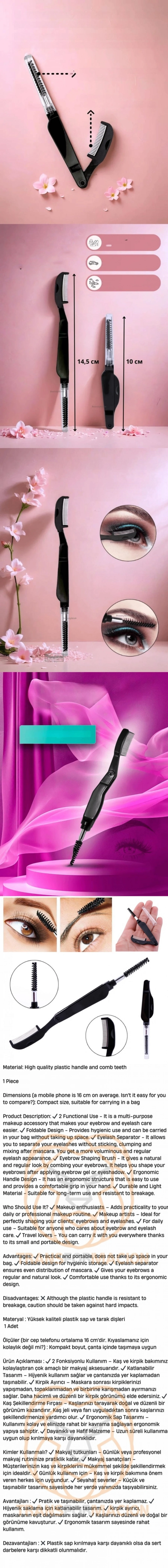 Avantajları : Pratik ve taşınabilir, çantanızda yer kaplamaz. Hijyenik saklama için katlanabilir tasarım. kirpik ayırıcı, maskaranın eşit dağılmasını sağlar. Kaşlarınızı düzenli ve doğal bir görünüme kavuşturur. Ergonomik tasarım sayesinde rahat kullanım.