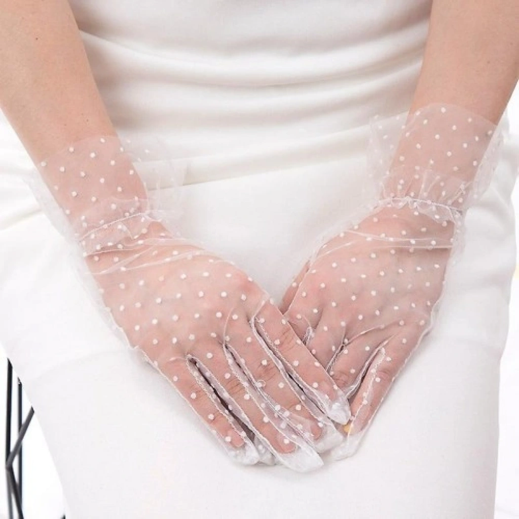 ve AvantajlarıKaliteli İthal Tül: Yüksek kaliteli ve esnek tül malzemeden üretilmiştir. Teninize yumuşak bir temas sağlar ve pürüzsüz bir görünüm sunar.Zarif Puantiye Detayları: Tül üzerindeki minik beyaz puantiyeler, tasarıma hem neşeli hem de vintage bir hava katar.Şık Güpür (Fırfır) Bileklik: Bilek kısmındaki fırfırlı güpür detayı, eldivenin bitiş noktasını estetik bir şekilde vurgular ve bileğinizi daha zarif gösterir.Yetişkinler İçin İdeal Kalıp: Esnek yapısı sayesinde farklı el ölçülerine uyum sağlar ve parmak hareketlerinizi kısıtlamaz.Hafif ve Transparan: Şeffaf yapısı sayesinde ellerinizin doğal güzelliğini gizlemez, aksine şık bir filtre gibi ön plana çıkarır.Kullanım Alanları ve Kombin ÖnerileriGelin ve Nişan Aksesuarı: Modern veya vintage tarzda bir gelinliği tamamlamak, dış çekimlerde fark yaratmak için mükemmel bir seçimdir.Nikah ve Save the Date: Sade bir nikah elbisesini anında ikonik bir görünüme kavuşturur.Retro ve Vintage Temalı Partiler: 1950'ler ve 60'lar moda akımlarını yansıtan konsept davetlerin vazgeçilmez parçasıdır.Mezuniyet ve Gala Geceleri: Şık gece elbiselerine sofistike bir detay eklemek isteyenler için idealdir.Tiyatro ve Fotoğraf Çekimleri: Dramatik ve estetik bir çekim atmosferi yaratmak için en güçlü aksesuarlardan biridir.