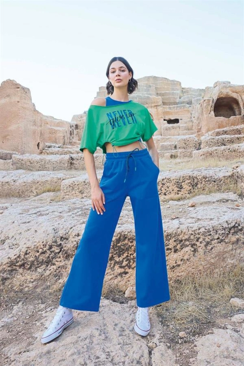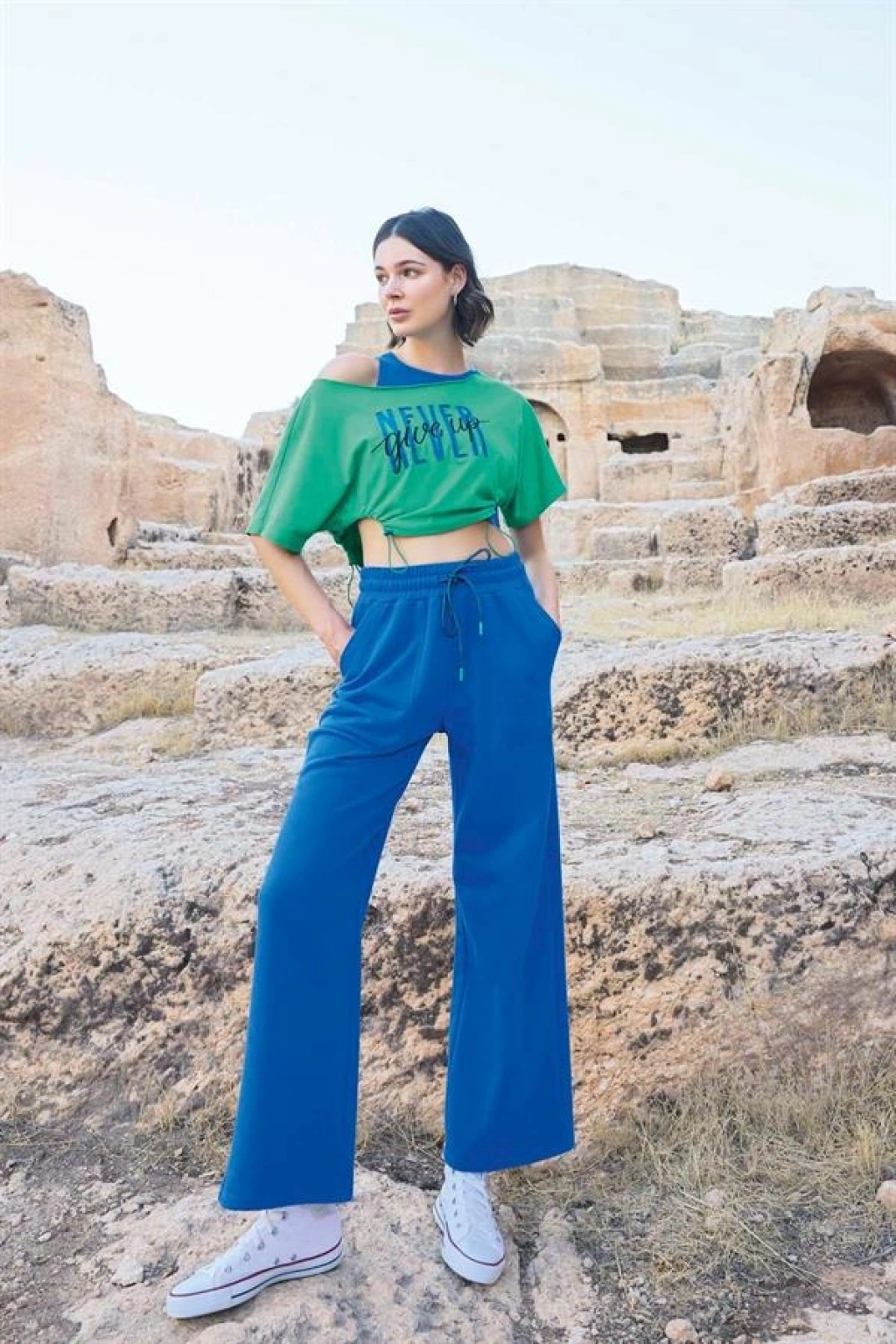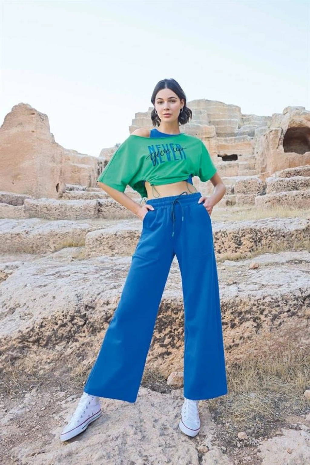 Üst: Yeşil renklidir, kısa kolludur, ""Never Give Up"" yazılıdır, pis yakalıdır, örme kumaştır.