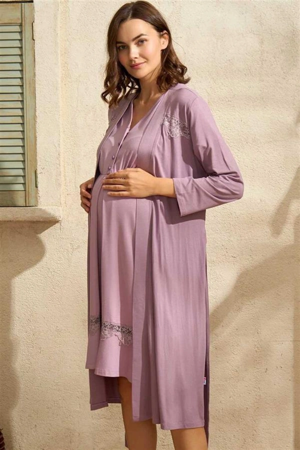VipMarketim Kısa Yarım Kol V Yaka Kadın Viskon Düz Yazlık Uzun Dantel Detaylı Hamile Gecelik Sabahlık Anıl (Kod:5776)
