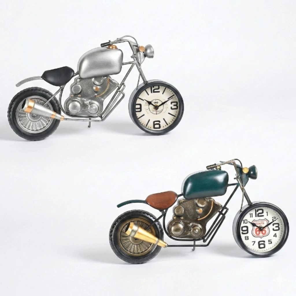 Klasik motor tasarımlı masaüstü saat, retro motosiklet estetiğini dekoratif bir saat formuyla buluşturan özgün ve dikkat çekici bir tasarıma sahiptir. Gövdesi klasik chopper tarzı motor detaylarıyla şekillendirilmiş olup, metal görünümlü motor bloğu, egzoz, sele ve jant detayları sayesinde gerçekçi bir obje hissi sunar. Ön tekerlek kısmına entegre edilmiş analog saat kadranı, büyük ve net rakamları sayesinde kolay okunabilirlik sağlar ve dekoratif yapısını işlevsellikle tamamlar. 45x25 cm ölçüleriyle masa, raf, konsol veya vitrin üzerinde güçlü bir duruş sergileyerek ortamın odak noktası haline gelir. Sessiz çalışan mekanizması sayesinde ofis, çalışma odası veya yaşam alanlarında rahatsız edici bir ses oluşturmaz. Retro, endüstriyel ve vintage dekorasyon stilleriyle uyumlu yapısı sayesinde kafe, ofis ve ev dekorasyonlarında estetik bir tamamlayıcı olarak kullanılabilir. Renk seçimi yapılamamaktadır; ürün, görsellerde yer alan motor modellerinden biri olacak şekilde karışık olarak gönderilmektedir. Koleksiyonluk görünümü ve detaylı işçiliğiyle hediye alternatifi olarak da öne çıkan bir masaüstü saat modelidir. Paket İçeriği1 adet klasik motor tasarımlı masaüstü saat