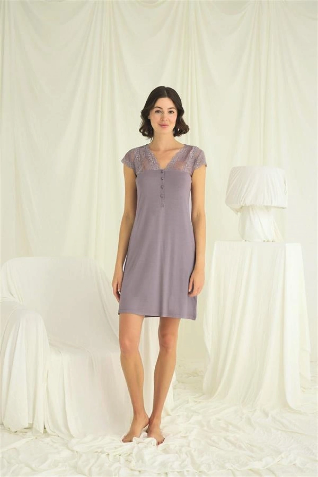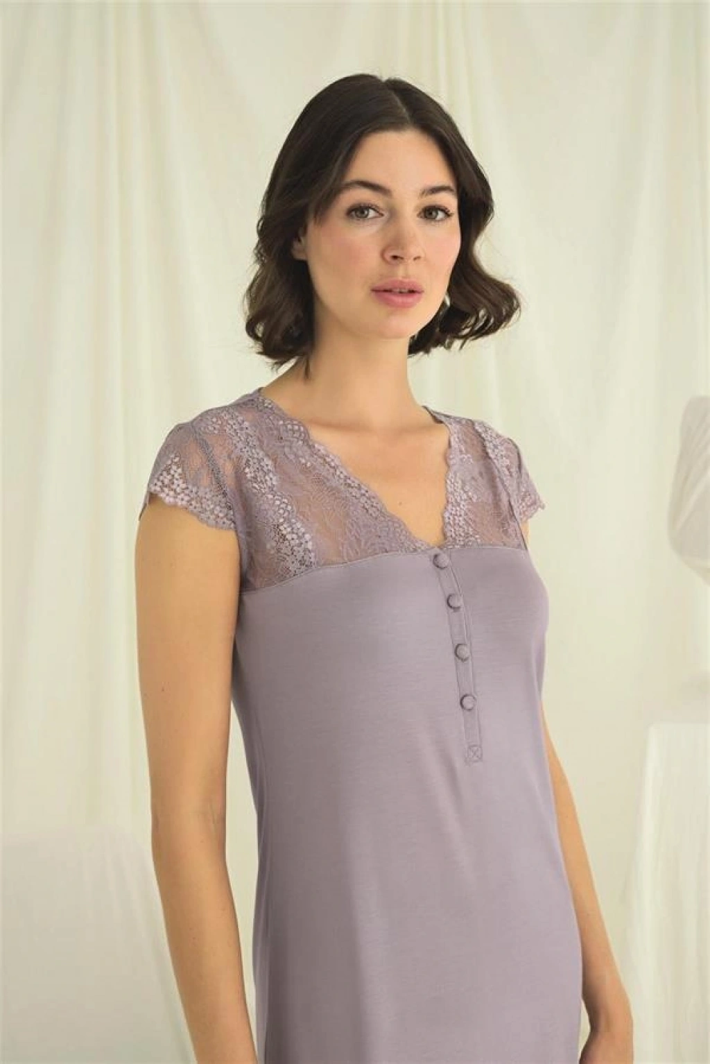 Vipmarketim Kolu Omzu Ve Yakası Dantelli Önü Düğmeli Gecelik
