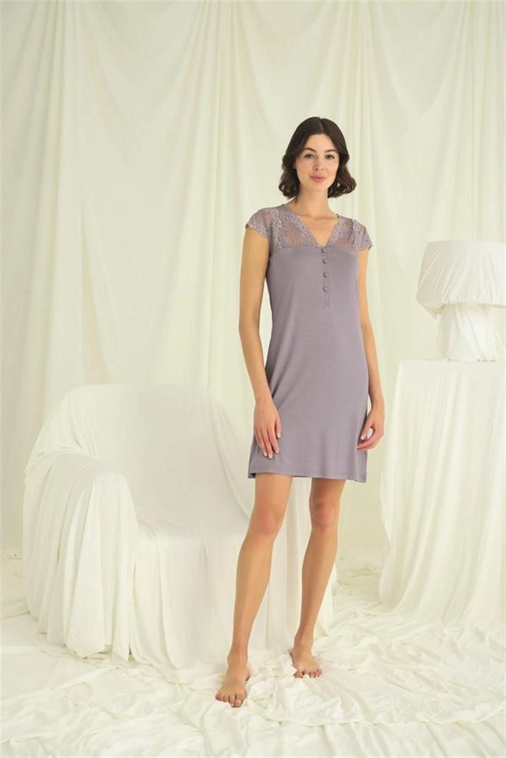 Gecelik: Gri renklidir, V yakalıdır, kolu, omzu ve yakası dantellidir, yakasının altı düğmelidir, kısa kolludur, örme kumaştır.