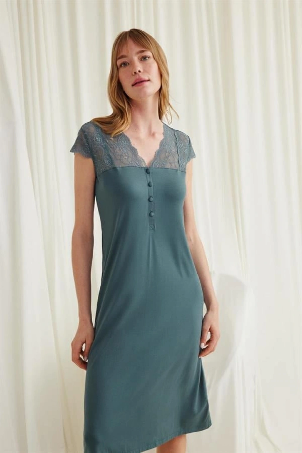 VipMarketim Kolu Omzu Ve Yakası Dantelli Önü Düğmeli Gecelik