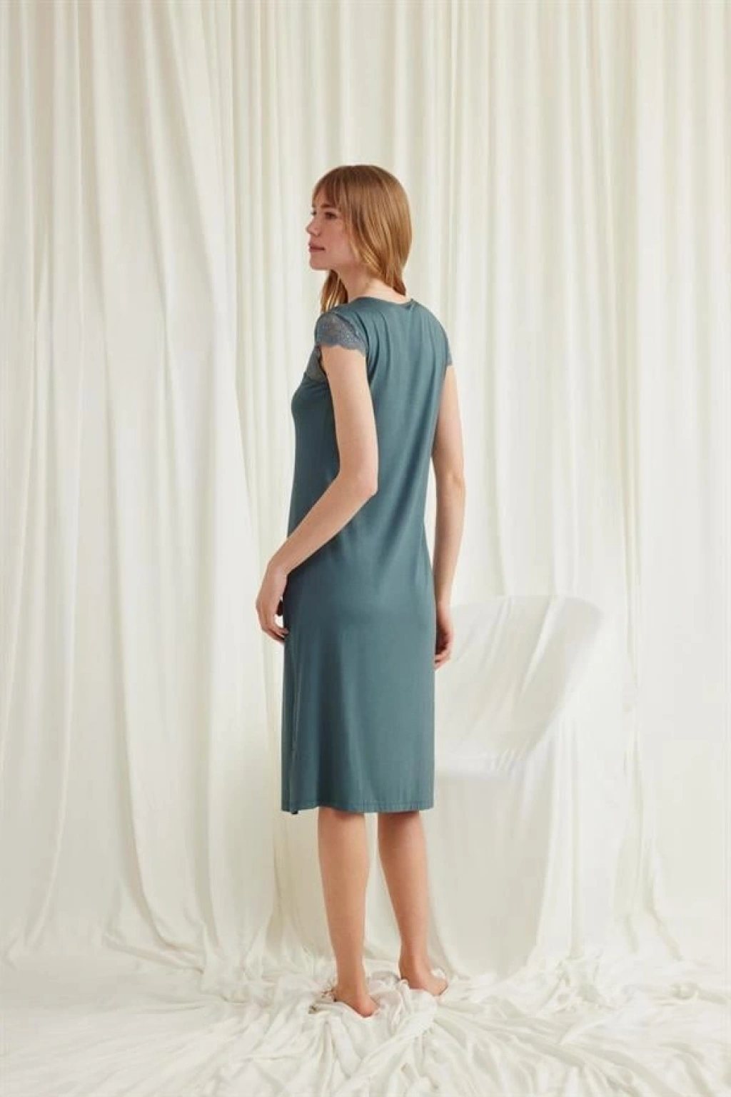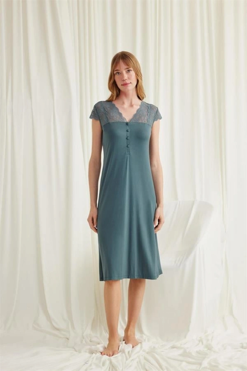 Gecelik: V yakalıdır, kısa kolludur, kolu ve omzu göğüs hizasına kadar dantellidir, yakasının altı düğmelidir, yeşil renklidir, örme kumaştır.
