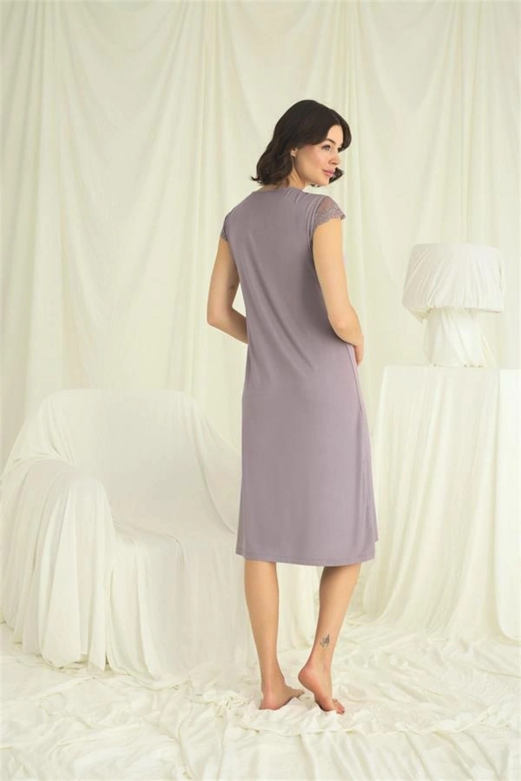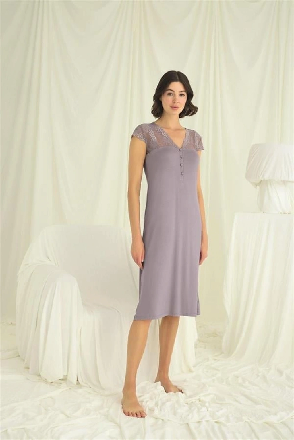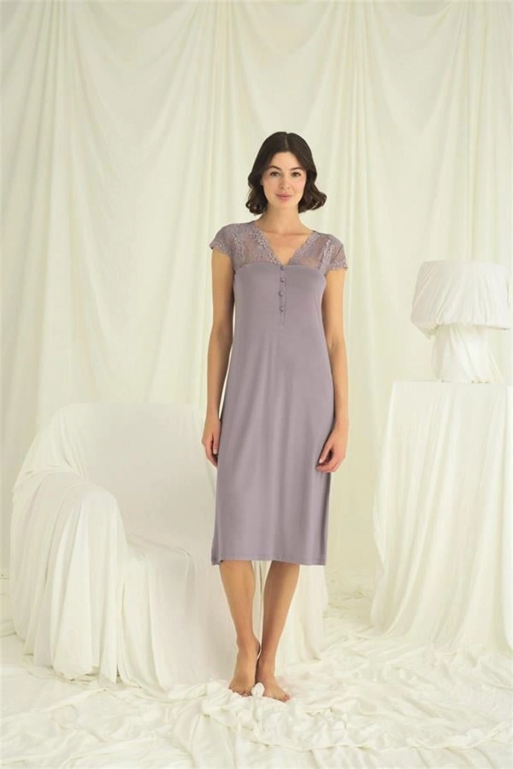 Gecelik: Gri renklidir, V yakalıdır, kolu, omzu ve yakası dantellidir, yakasının altı düğmelidir, kısa kolludur, örme kumaştır.