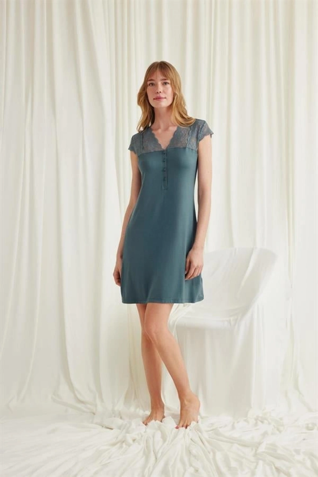 Gecelik: Yeşil renklidir, V yakalıdır, kolu, omzu ve yakası dantellidir, yakasının altı düğmelidir, kısa kolludur, örme kumaştır.