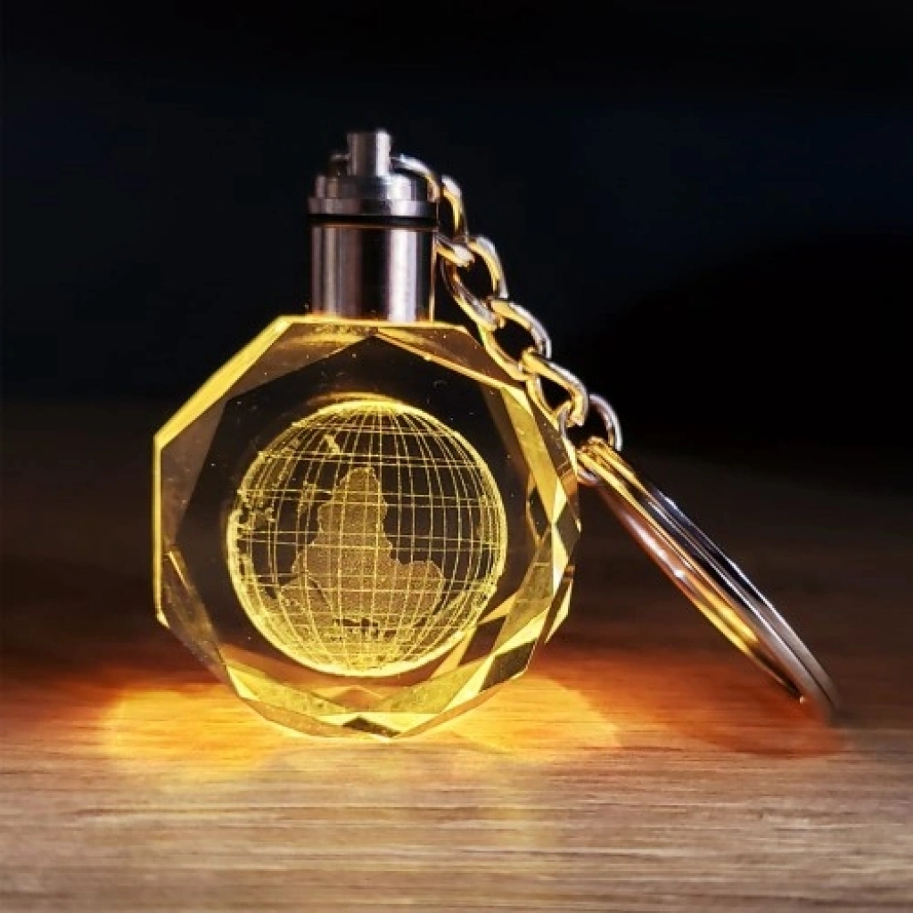 Kaliteli kristal cam malzemeden üretilmiştir. İçerisinde şık dünya motifi bulunur. Anahtarlık renk değiştirmektedir. Pil ile çalışır (piller pakete dahildir). Işık, anahtarlığı çevirdiğinizde yanar. Karanlıkta hoş bir görsel sunar. Son trend anahtarlık modellerindendir. Ölçüleri: Uzunluk: 10 cm