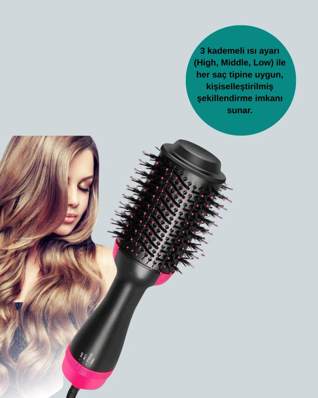 1200W Kurutmalı Saç Şekillendirici Fönlü Fırça, güzellik rutininizi kökten değiştirecek. Negatif iyon teknolojisi sayesinde saçınızdaki elektriklenmeyi ortadan kaldırır ve onlara ipeksi bir parlaklık kazandırır. 3 farklı ısı ayarı (soğuk, düşük, yüksek) ile saç tipinize uygun bakım yapabilirsiniz. Oval fırça tasarımı, yuvarlak kenarlarıyla saçınıza doğal hacim kazandırırken pürüzsüz bir bitiş sağlar.Kablo karışma derdi ise tarihe karışıyor! 360° dönebilen 2,5 metrelik kablo, rahat kullanım ve özgür hareket imkânı sunar. Hafif ve ergonomik tasarımı sayesinde uzun süreli kullanımda bile elinizi yormaz. Kullanımı son derece kolaydır: Fırçayı saçınızın altına yerleştirin, uçlara doğru yuvarlayın ve köklerde birkaç saniye bekleyerek dolgun bir görünüm elde edin. Böylece hem kurutma hem şekillendirme işlemlerini tek adımda tamamlayabilirsiniz.Ürün Özellikleri: Güç: 1200W Gerilim: 110-240V / 50-60Hz Sıcaklık: 60°C - 120°C Isı Ayarları: 4 Kademe Negatif iyon teknolojisi Oval fırça tasarımı 2,5 metre 360° dönebilen kabloEvde profesyonel kuaför kalitesinde sonuçlar için bu eşsiz saç şekillendiriciyi hemen deneyin!