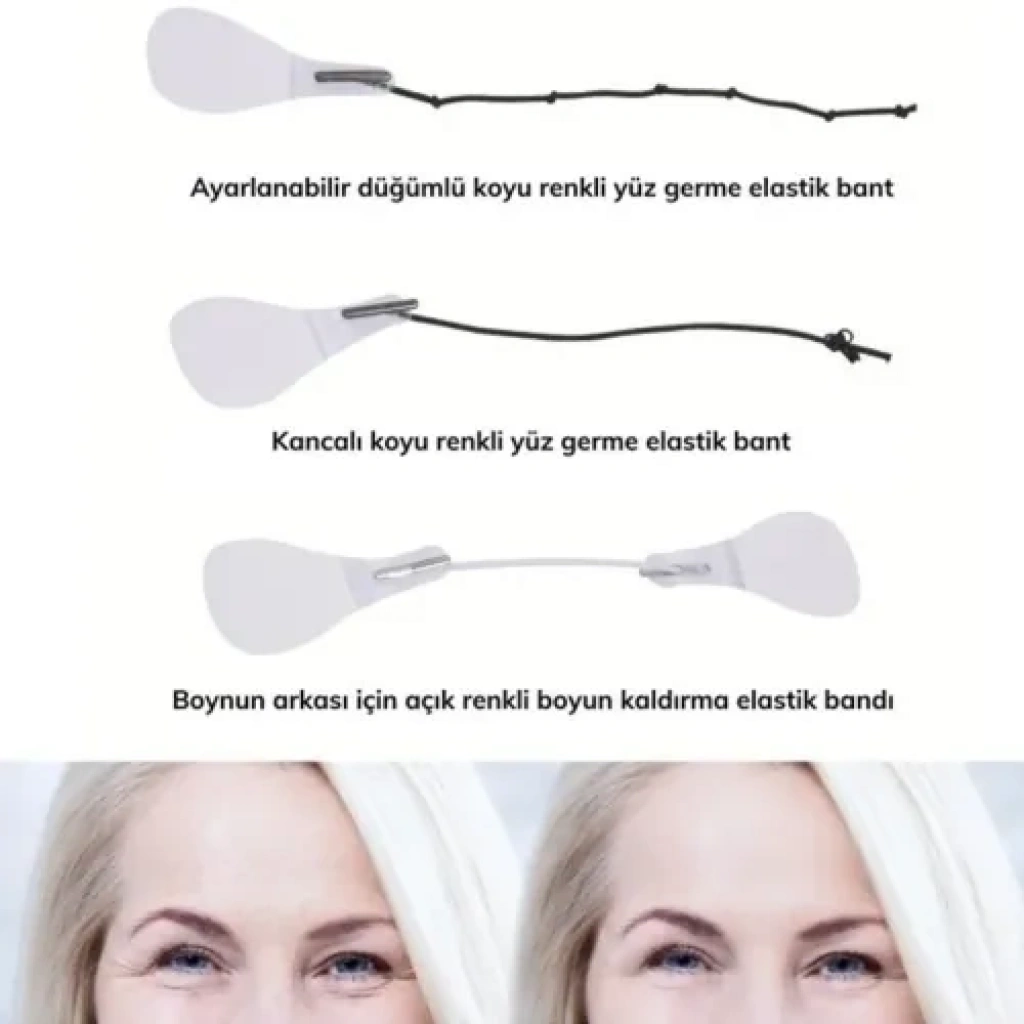 V Şekilli Yüz Hattı: Yüksek esnekliğe sahip bantlar, cildi yukarı doğru kaldırarak daha sıkı ve belirgin bir yüz hattı oluşturur.Hipoalerjenik ve Güvenli: Çevre dostu silikon ve kauçuk malzemelerden üretilmiştir; cildi tahriş etmez, yumuşak ve konforlu bir kullanım sunar.Mükemmel Gerdirme Performansı: Yüz, boyun, çene ve göz çevresindeki gevşek cildi toparlayarak kırışıklık görünümünü minimize eder.Görünmez Tasarım: Şeffaf rengi sayesinde makyaj altında veya saç diplerinde kolayca gizlenebilir.Su Geçirmez: Terleme veya nemden etkilenmeyen yapısıyla gün boyu sabit kalır.Kullanım AlanlarıÖzel Günler ve Etkinlikler: Düğünler, mezuniyetler, toplantılar ve partilerde kusursuz bir görünüm için idealdir.Profesyonel Çekimler: Modellik, fotoğraf çekimleri ve video kayıtlarında yüz hatlarını keskinleştirmek amacıyla kullanılır.Günlük Bakım: Sarkan yüz kaslarını geçici olarak germek ve daha enerjik bir görünüm kazanmak isteyen herkes tarafından tercih edilebilir.Seyahatler: Pratik uygulanabilirliği sayesinde seyahatlerde anında güzellik dokunuşu sağlar.Paket İçeriği40 Adet Şeffaf Yüz Germe BandıKademeli Uygulama ve Germe Lastikleri