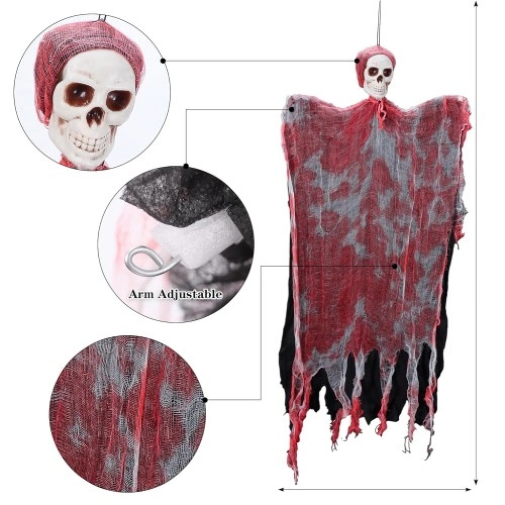 Led Işıklı Kahkaha Atan Sesli & Sensörlü Ürpertici Kuru Kafa Hayalet DekorCadılar Bayramı ve korku temalı partilerinizde misafirlerinizi iliklerine kadar titretmeye hazır olun! 90x50 cm boyutlarındaki bu devasa saçaklı hayalet dekor, sadece bir süsleme değil; ses, ışık ve hareket sensörünü birleştiren interaktif bir korku deneyimidir. Karanlıkta parlayan kanlı gözleri ve aniden yükselen ürpertici kahkahasıyla mekanın en korkunç köşesini yaratacaksınız.Öne Çıkan ÖzelliklerAkıllı Hareket Sensörü: Birisi yaklaştığında veya bir ses duyulduğunda otomatik olarak devreye girer. Misafirlerinize beklemedikleri anda unutulmaz bir şok yaşatır.Led Işıklı Kanlı Gözler: Kuru kafa figürünün göz yuvalarında bulunan kırmızı Led ışıklar, hayalet aktifleştiğinde parlayarak karanlıkta dehşet verici bir odak noktası oluşturur.Ürpertici Ses Efektleri: Sensör tetiklendiğinde yankılanan yüksek sesli ve tüyler ürpertici kahkaha efekti, atmosferin gerilimini zirveye taşır.Dehşet Verici Tasarım: 90 cm uzunluğundaki kanlı saçaklı kumaşı ve detaylı kuru kafa yapısı, rüzgarda veya hareket ettirildiğinde süzülerek gerçek bir hayalet illüzyonu yaratır.Neden Bu Dekoru Seçmelisiniz?Tam Etkileşim: Statik süslerin aksine hareket ve sesle tepki verdiği için partinizin en çok konuşulan detayı olur.Büyük Ölçekli Etki: 90x50 cm ölçüleri sayesinde tavanlardan veya kapı girişlerinden sarkıtıldığında alanı tamamen domine eder.Kolay Kurulum: Hafif yapısı sayesinde bir çiviye, dala veya kornişe kolayca asılabilir; karmaşık montaj gerektirmez.Kullanım AlanlarıKorku Evleri ve Kaçış Odaları: Atmosferi profesyonel bir seviyeye taşımak ve oyuncuları şaşırtmak için.Halloween Partileri: Kapı girişine asarak misafirlerinizi "korkunç" bir kahkaha ile karşılamak adına.Bahçe ve Teras Dekorasyonu: Ağaç dallarından sarkıtarak gece karanlığında yoldan geçenlere sürpriz yapmak için.Vitrin Tasarımları: Mağazalarda Cadılar Bayramı konseptini dikkat çekici ve interaktif hale getirmek adına.
