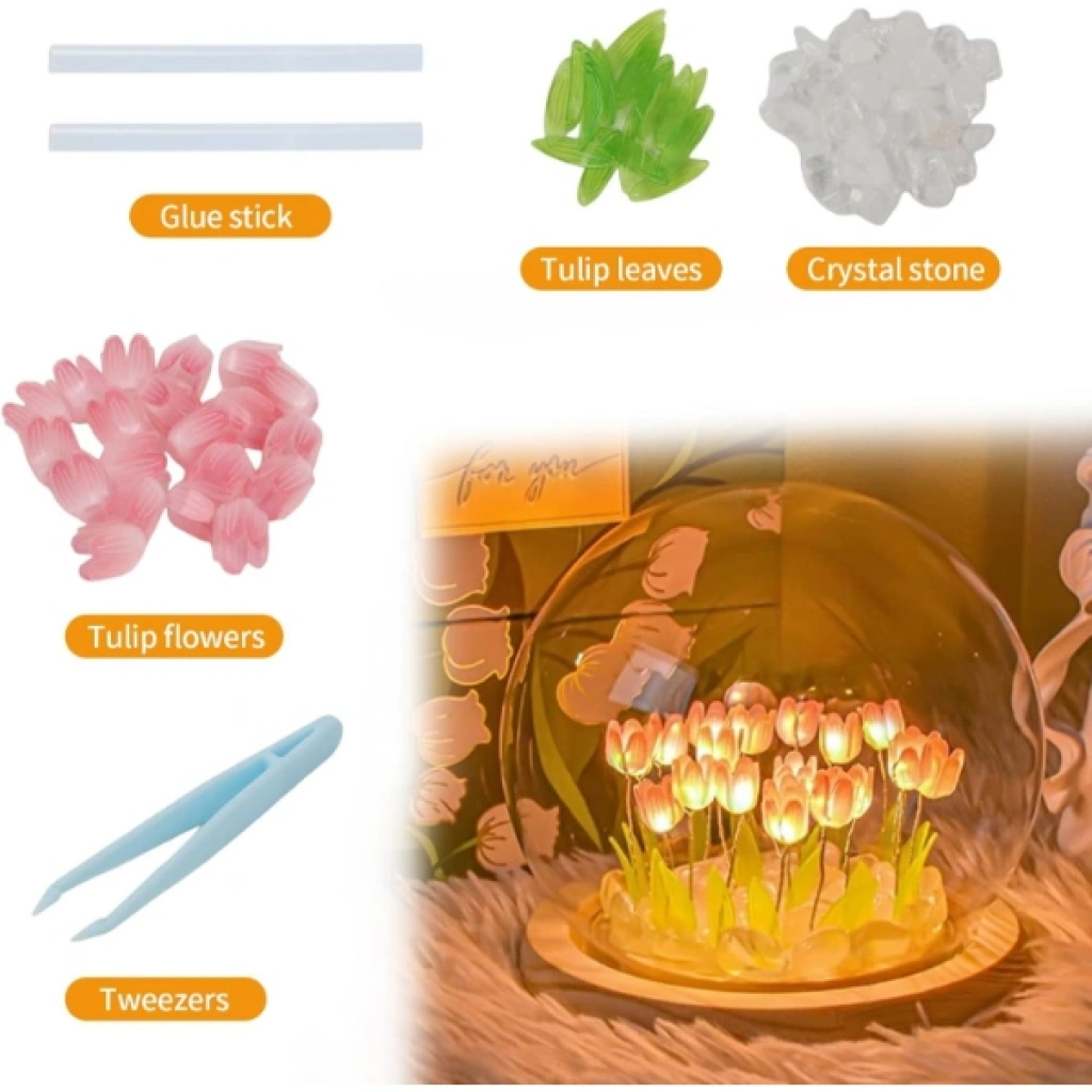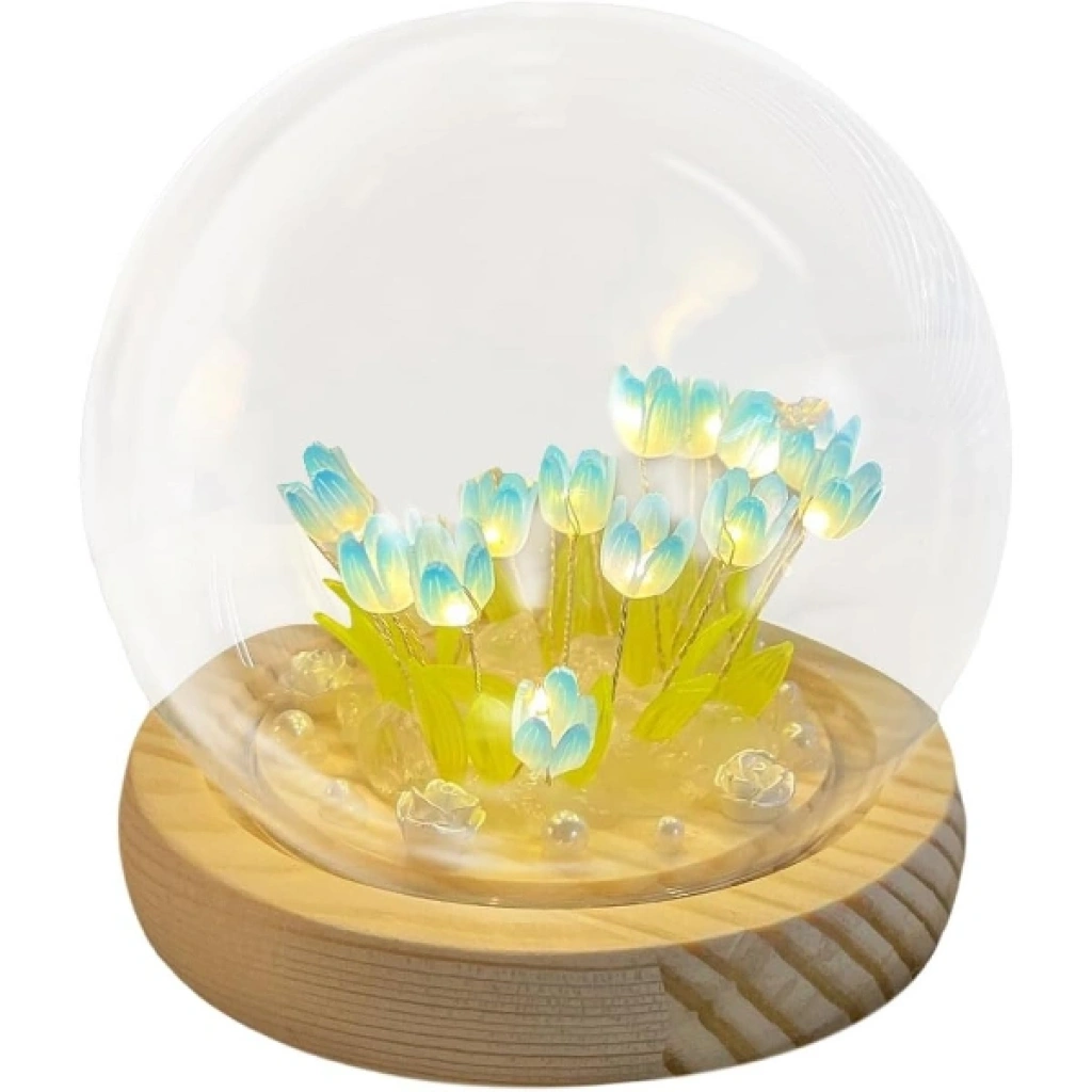 Şeffaf cam fanus, yapay lale çiçekleri, kristal taşlar ve ahşap taban ile hazırlanmış bu dekoratif ürün, tamamen hazır halde gönderilmektedir. İçerisindeki lale çiçekleri ve kristal taşlar özenle yerleştirilmiş olup, kullanıcıdan herhangi bir kurulum veya düzenleme gerektirmez. LED ışıklarla donatılmış yapısı sayesinde sıcak ve yumuşak bir ışık yayarak bulunduğu ortama hoş ve huzurlu bir atmosfer kazandırır.Kompakt boyutu sayesinde masa, raf, komodin veya yatak odası dekorasyonu için ideal bir kullanım sunar. Ev dekorasyonunda, romantik sürprizlerde, özel günlerde hediye alternatifi olarak veya gece lambası amacıyla rahatlıkla tercih edilebilir. Düşük enerji tüketimine sahip LED ışıkları uzun ömürlü kullanım sağlarken, modern ve zarif tasarımı her türlü yaşam alanına uyum gösterir. Şık görünümü ve pratik kullanımıyla bu fanus, özellikle hediye arayanlar için hem estetik hem de işlevsel bir dekoratif aksesuar olarak öne çıkar.Paket İçeriği 1 adet lale cam küre