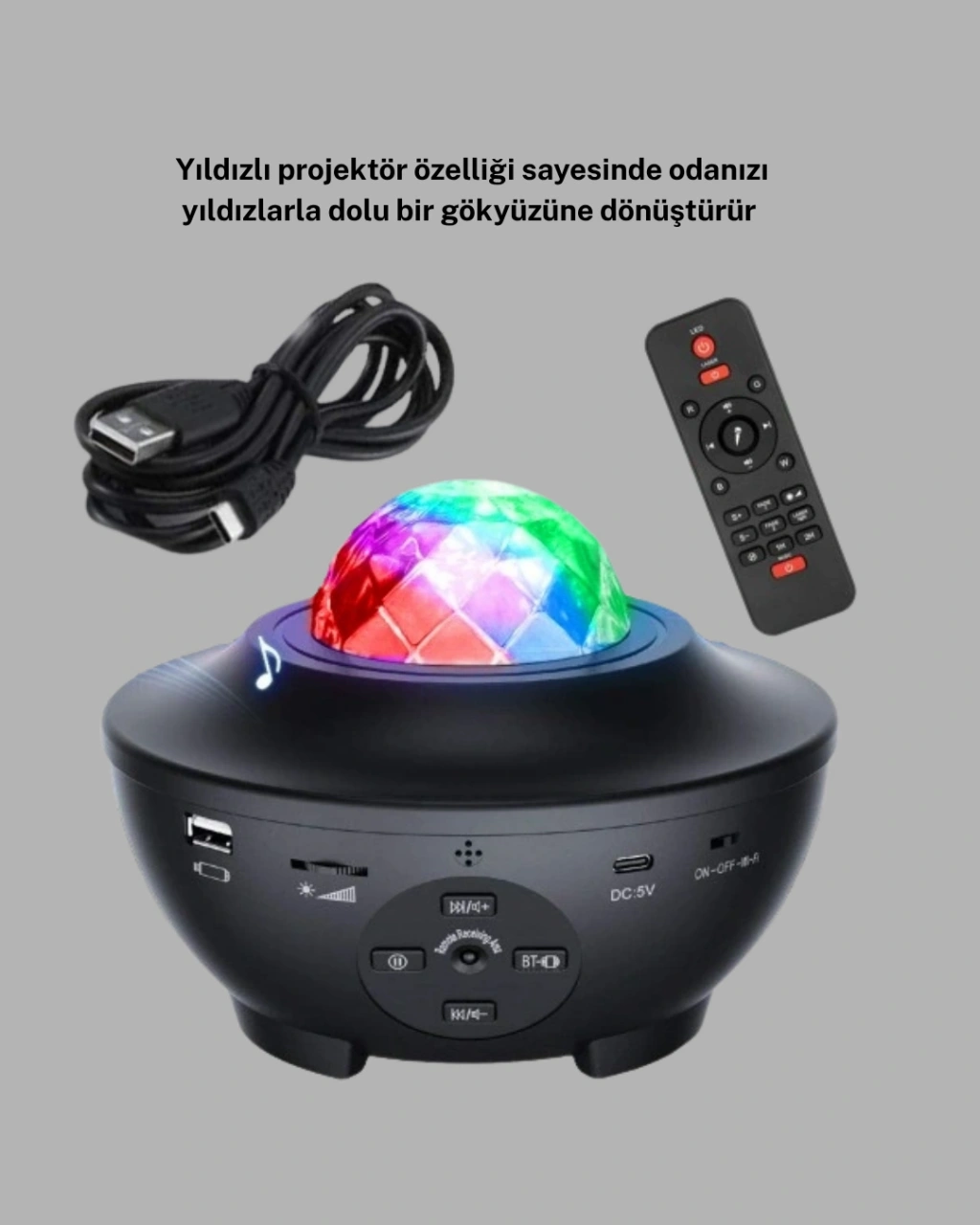 Yıldızlı projektör, evinizi gökyüzüyle buluşturan ve özel anlarınıza büyülü bir hava katan güçlü bir atmosfer aydınlatma cihazıdır. Yıldız efektleri ve galaksi görünümü sayesinde duvarlarda ve tavanda benzersiz bir görsel şölen oluşturur. Farklı renk seçenekleri ile odanın havasını saniyeler içinde değiştirebilir, ister huzurlu ister enerjik bir ambiyans yaratabilirsiniz.Projektörün ayarlanabilir parlaklık seviyeleri, kullanıcıya tam kontrol imkânı sunar. Loş bir gece ışığı, dinlendirici bir meditasyon ortamı veya etkileyici bir parti atmosferi… Hepsi tek bir cihazla mümkündür. Renkli ışık kombinasyonları çocuklar için masalsı bir uyku ortamı oluştururken yetişkinler için estetik ve şık bir dekoratif aydınlatma sunar.Cihazın kullanım kolaylığı sayesinde her yaş grubu rahatlıkla kullanabilir. Üzerindeki butonlarla renk modu, parlaklık seviyesi ve galaxy efekti hızlı şekilde değiştirilebilir. Hafif ve taşınabilir olması, projektörü ev içinde dilediğiniz yere taşımanızı sağlar. Yatak odası, salon, çalışma odası, çocuk odası, parti ortamı gibi pek çok alanda kullanılabilir.LED ışık teknolojisi, düşük enerji tüketimiyle uzun süreli kullanım sağlar. Ayrıca düşük ısı yaydığı için güvenli bir kullanım deneyimi sunar. Sessiz çalışma özelliği, uyku ve meditasyon sırasında rahatsızlık yaratmaz.Hem dekorasyon hem fonksiyon olarak ön plana çıkan yıldızlı projektör, yaşam alanlarınıza modern, etkileyici ve rahatlatıcı bir ışık atmosferi katar. Özel günlerde, romantik anlarda veya çocukların uyku saatlerinde kullanabileceğiniz çok yönlü bir aydınlatma çözümüdür.