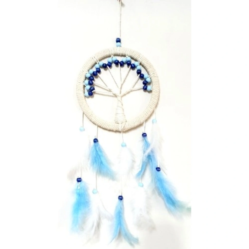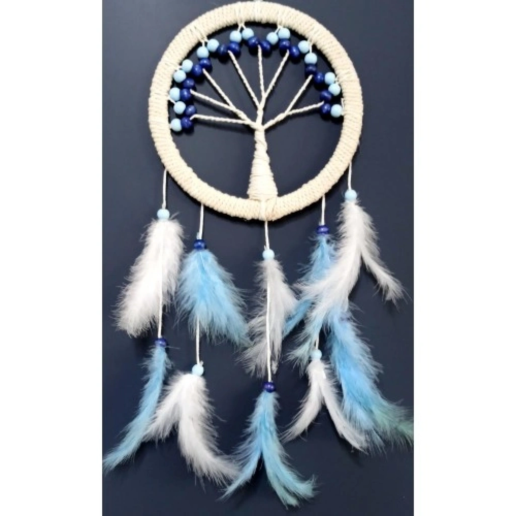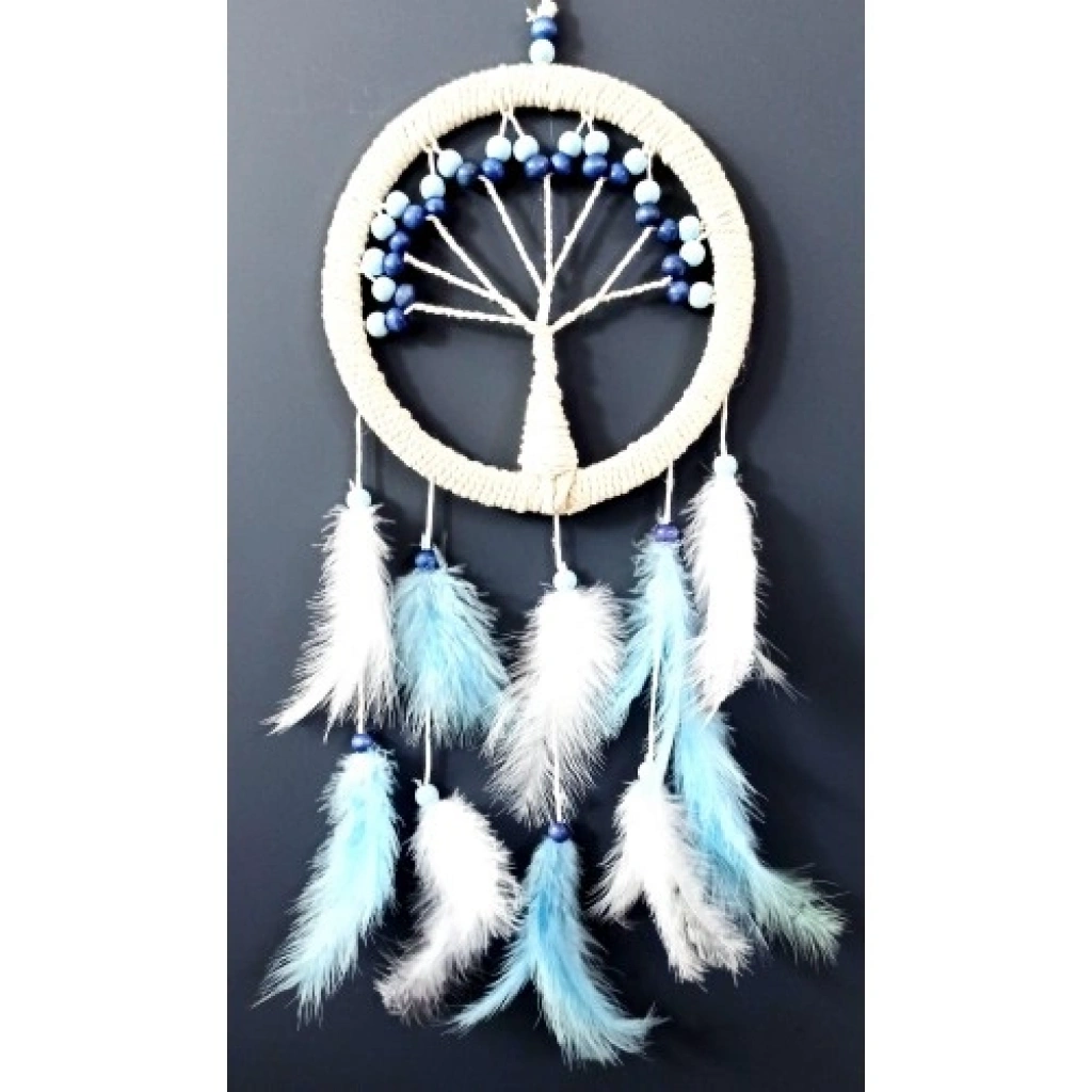 Hayat ağacı duvar süsümüzün yuvarlak kısmı 21 santimetre çapındadır. Duvar süsümüz ip dahil 54 santimetre boyundadır. Ürünümüz mavi ve beyaz kuş tüyleriyle süslenmiştir.