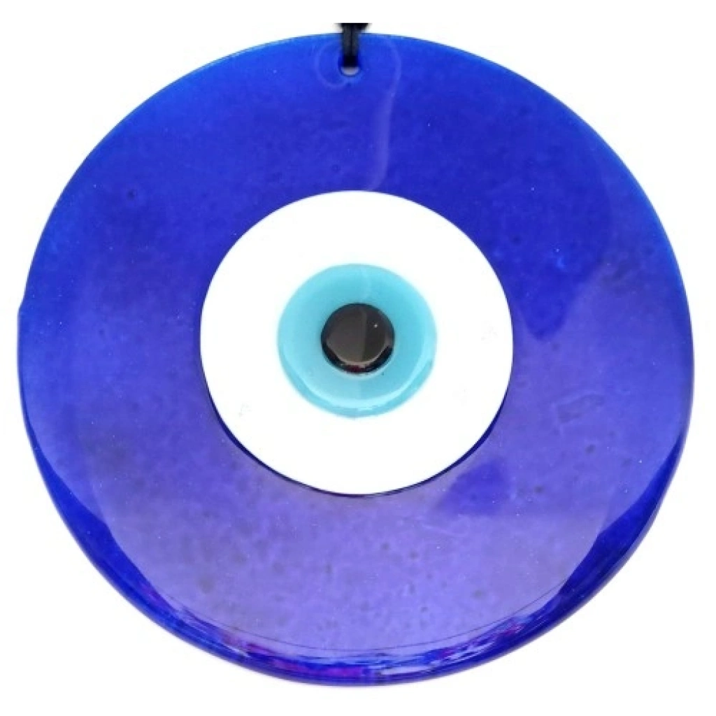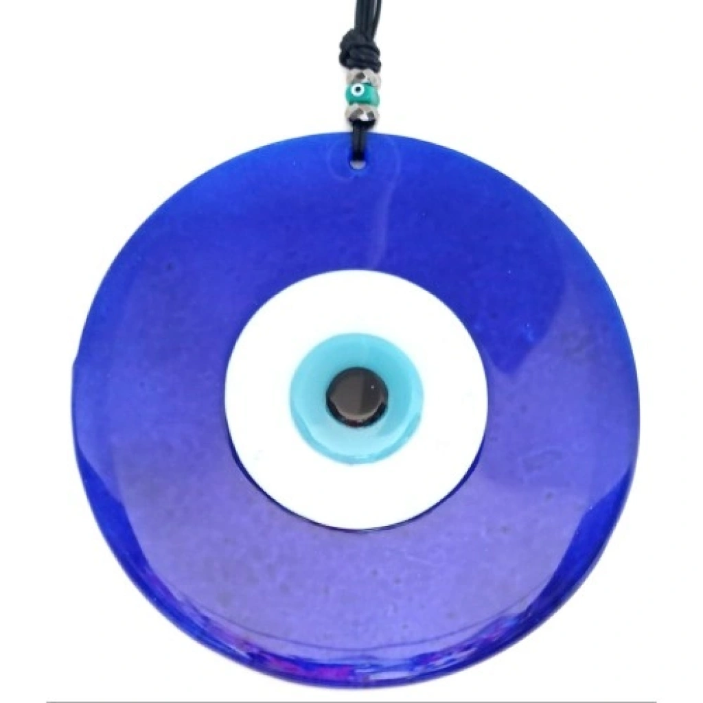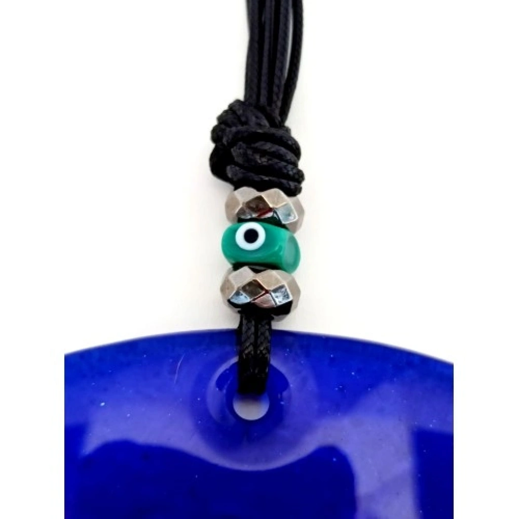 Mavi renk nazar boncuklu deri ipli ürünümüz tamamen el işçiliği ile üretilmiştir. 8 mm kalınlığında birinci kalite camla üretilmiştir. Cam duvar süsümüz 20 santimetre çapındadır. Ürünümüz ip dahil 32 santimetre boyundadır.
