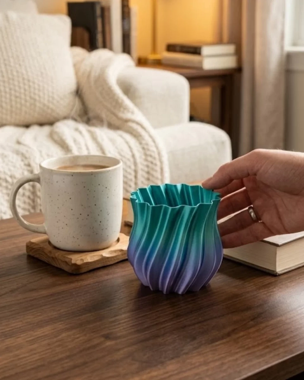 Kıvrımlı formu ve modern çizgileri ile öne çıkan 3D mavi vazo, dekorasyonda fark yaratmak isteyenler için tasarlanmıştır. Dalgalı yüzey yapısı, klasik vazo tasarımlarından ayrılarak bulunduğu ortama hareket ve estetik bir derinlik kazandırır. Mavi rengin sakinleştirici ve dengeli etkisi, yaşam alanlarında huzurlu bir atmosfer oluşturur.Mini boyutlu yapısı sayesinde özellikle dar alanlarda kullanım için oldukça uygundur. Büyük ve yer kaplayan dekoratif ürünler yerine, küçük ama etkili bir dokunuş arayanlar için ideal bir üründür. Çalışma masası, komodin, TV ünitesi veya raf dekorasyonu için mükemmel bir seçimdir.Ürünün yüzeyinde bulunan kıvrımlı detaylar, ışıkla etkileşime girerek farklı ton geçişleri oluşturur. Bu sayede her açıdan farklı bir estetik sunar. Gündüz doğal ışıkta daha canlı bir görünüm elde edilirken, gece aydınlatmalarında daha soft ve şık bir atmosfer yaratır.Modern, minimal ve endüstriyel dekorasyon tarzları ile uyum sağlayan bu vazo, farklı yaşam alanlarında rahatlıkla kullanılabilir. Aynı zamanda hediye olarak da tercih edilebilecek şık bir üründür. Yeni ev hediyesi, doğum günü veya özel günler için estetik ve kullanışlı bir alternatif sunar.