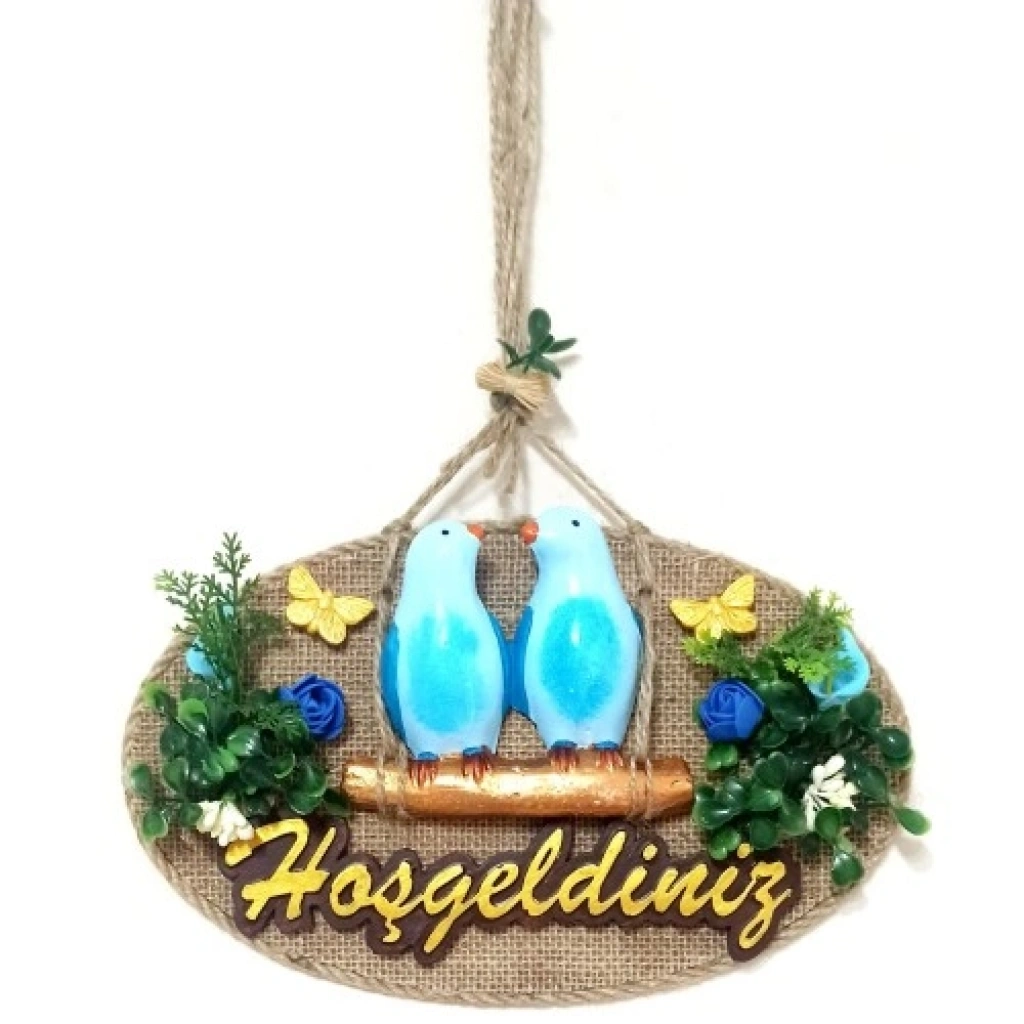 Mavi kuşlu kapı süsümüz ipsiz 26 santimetre eninde, 16 santimetre boyundadır. Ürünümüz ip dahil 29 santimetre boyundadır. Ürünümüzün 4 mm mdf üzerine jüt kumaş sarılarak zemini hazırlanmaktadır. Daha sonra objeler elde boyanarak ürünümüz hazırlanmaktadır.