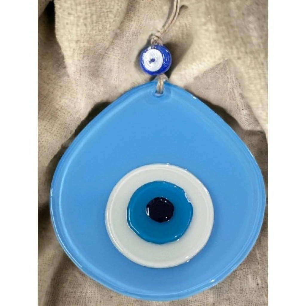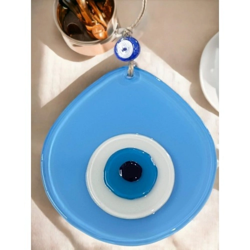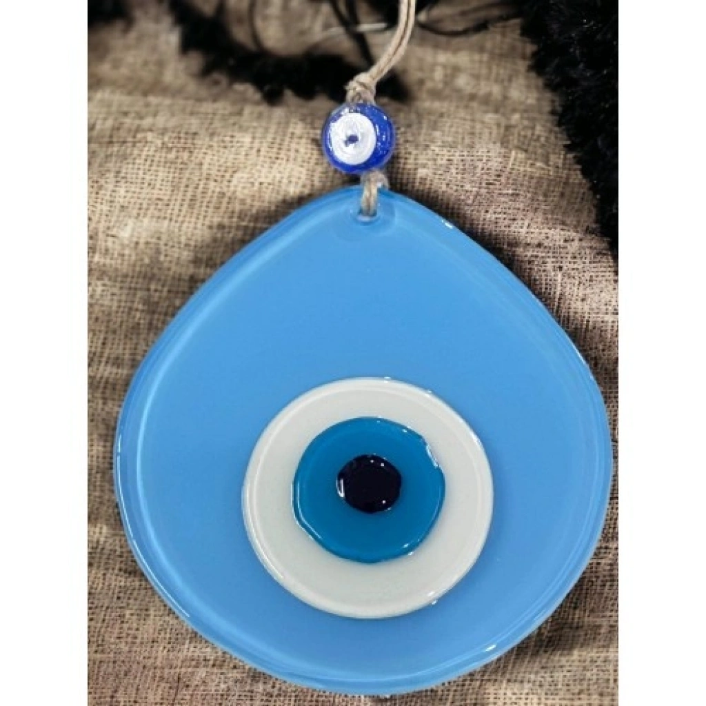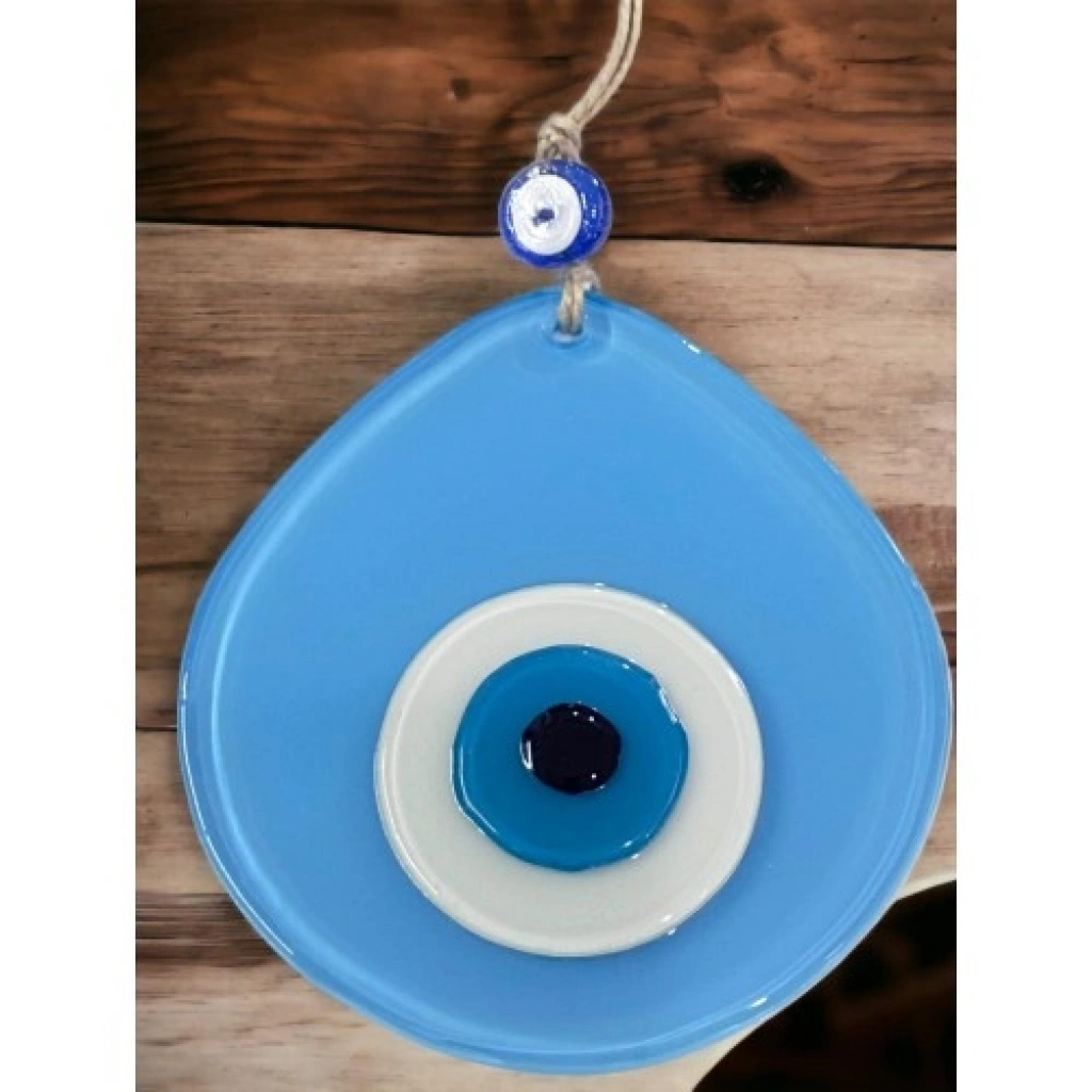 Açık mavi renk damla desen tasarıma sahiptir.Mavi cam nazar boncuğu ile süslenmiştir.Tamamen el yapımıdır ve cam malzemeden üretilmiştir.Duvar süsü ve nazarlık olarak kullanıma uygundur. Ürün ÖlçüleriCam kısmı 13 x 12 santimetre ölçülerindedir.İp dahil toplam uzunluğu 21 santimetredir.