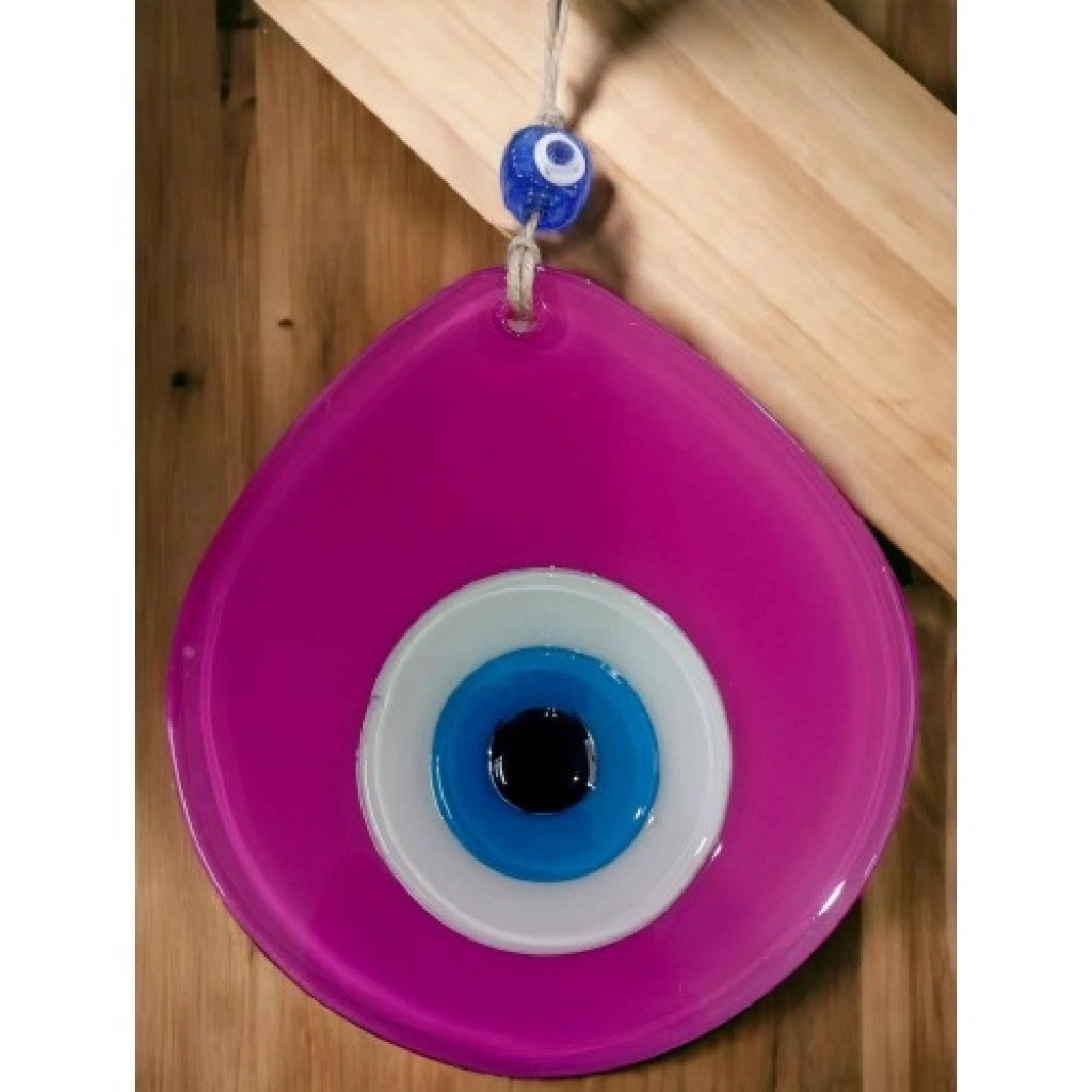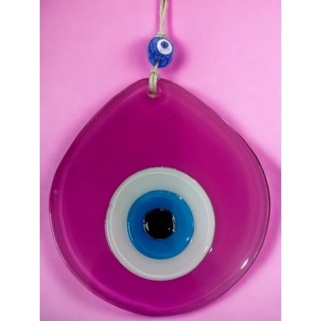 Pembe renk damla desen tasarıma sahiptir.Mavi cam nazar boncuğu ile süslenmiştir.Tamamen el yapımıdır.Cam malzemeden üretilmiştir.Duvar süsü ve nazarlık olarak kullanıma uygundur. Ürün ÖlçüleriCam kısmı: 13 x 12 santimetreİp dahil toplam uzunluk: 21 santimetre