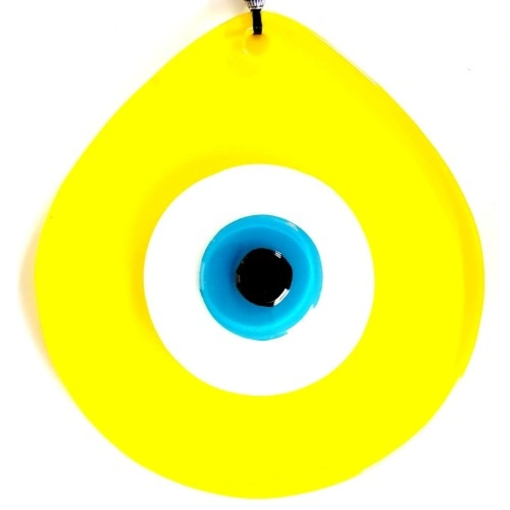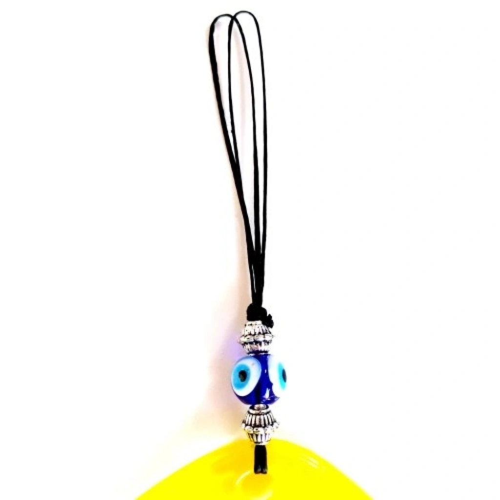 Malzeme: El yapımı cam Renk: Sarı zemin üzerine mavi nazar boncuğu Model: Damla desenli el yapımı tasarım Ölçüler: Genişlik: 12 cm Yükseklik: 13 cm Toplam uzunluk (ip dahil): 21 cm Birinci kalite cam işçiliği Modern ve dekoratif görünüm Hem iç mekan dekorasyonu hem de hediye amaçlı ideal seçim