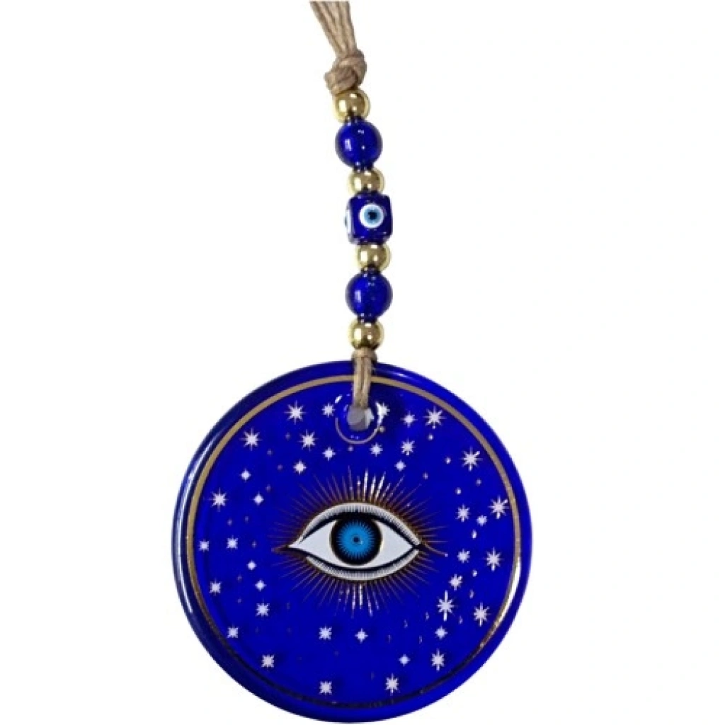 Mavi Yıldız İşlemeli Göz Model Duvar Süsü Nazar Boncuklu Duvar DekoruMavi, huzuru ve koruyucu enerjiyi simgeleyen rengiyle tasarlanan bu yıldız işlemeli göz model duvar süsü, nazar boncuğu detayıyla estetik ve anlamı bir arada sunan özel bir dekoratif üründür. Göz figürü nazardan korunma inancını temsil ederken, yıldız motifi tasarıma zarif ve dikkat çekici bir dokunuş katar.Ürünümüz mavi cam nazar boncuğundan tamamen el işçiliğiyle üretilmiştir. Camın parlak ve canlı yapısı, yıldız işlemeli göz motifini ön plana çıkararak bulunduğu ortama ferah ve şık bir görünüm kazandırır. El yapımı olması sayesinde her ürün kendine özgü detaylara sahiptir ve benzersizdir.Mavi yıldız işlemeli göz model cam duvar süsümüzün yuvarlak ana gövdesi 13 santimetre çapındadır. İp dahil yaklaşık 30 santimetre toplam uzunluğa sahiptir. Hafif yapısı sayesinde duvara, kapıya, pencere önüne veya farklı dekoratif alanlara kolaylıkla asılabilir.Salon, antre, ofis ve iş yeri dekorasyonları için ideal olan bu nazar boncuklu cam duvar dekoru; yeni ev hediyesi, iş yeri açılışı ve özel günler için estetik ve anlamlı bir hediyelik alternatifi sunar.