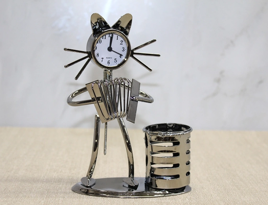Metal akordiyon çalan müzisyen kedi figürü, dekoratif şıklığıyla çalışma masalarına farklı bir hava katar. El yapımı görünümlü detaylı tasarımı sayesinde hem müzik tutkunlarına hem de kedi severlere hitap eder. Saat fonksiyonu, ürünü sadece dekoratif olmaktan çıkararak pratik bir kullanım sağlar. Yan kısmında yer alan kalemlik bölümü ise masa düzenini korumaya yardımcı olur. 17x12 cm ölçüleriyle kompakt bir boyuta sahip olan bu masa üstü aksesuarı, hediye olarak da ideal bir tercihtir.Paket İçeriği1 adet Metal Akordiyon Çalan Müzisyen Kedi Müzisyen Saat Ve Kalemlik